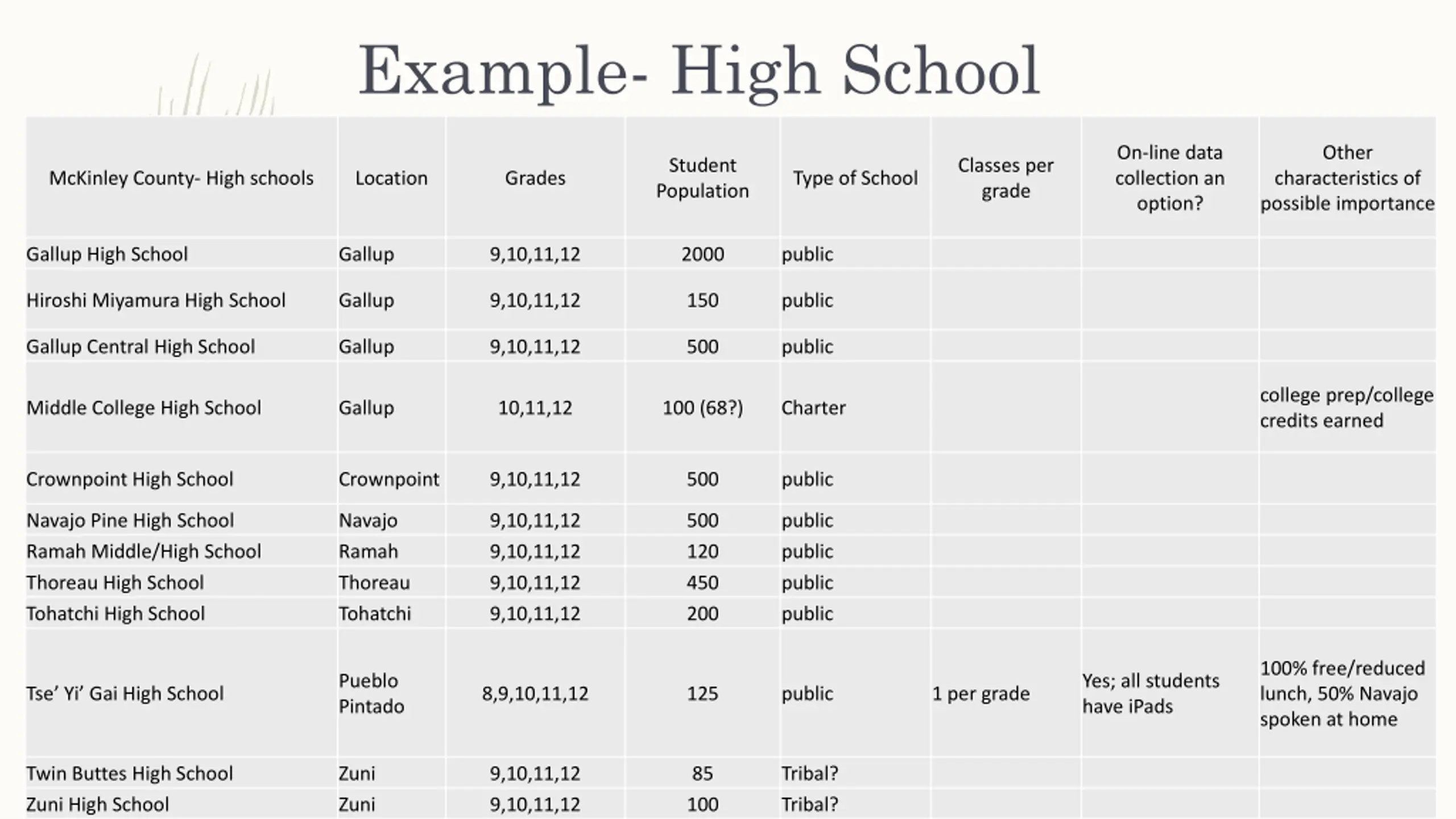 Example- High School On-line data collection an option? Other Student Population Classes per grade McKinley County- High schools Location Grades Type of School characteristics of possible importance Gallup High School Gallup 9,10,11,12 2000 public Hiroshi Miyamura High School Gallup 9,10,11,12 150 public Gallup Central High School Gallup 9,10,11,12 500 public college prep/college credits earned Middle College High School Gallup 10,11,12 100 (68?) Charter Crownpoint High School Crownpoint 9,10,11,12 500 public Navajo Pine High School Ramah Middle/High School Thoreau High School Tohatchi High School Navajo Ramah Thoreau Tohatchi 9,10,11,12 9,10,11,12 9,10,11,12 9,10,11,12 500 120 450 200 public public public public 100% free/reduced lunch, 50% Navajo spoken at home Pueblo Pintado Yes; all students have iPads Tse Yi Gai High School 8,9,10,11,12 125 public 1 per grade Twin Buttes High School Zuni High School Zuni Zuni 9,10,11,12 9,10,11,12 85 100 Tribal? Tribal?