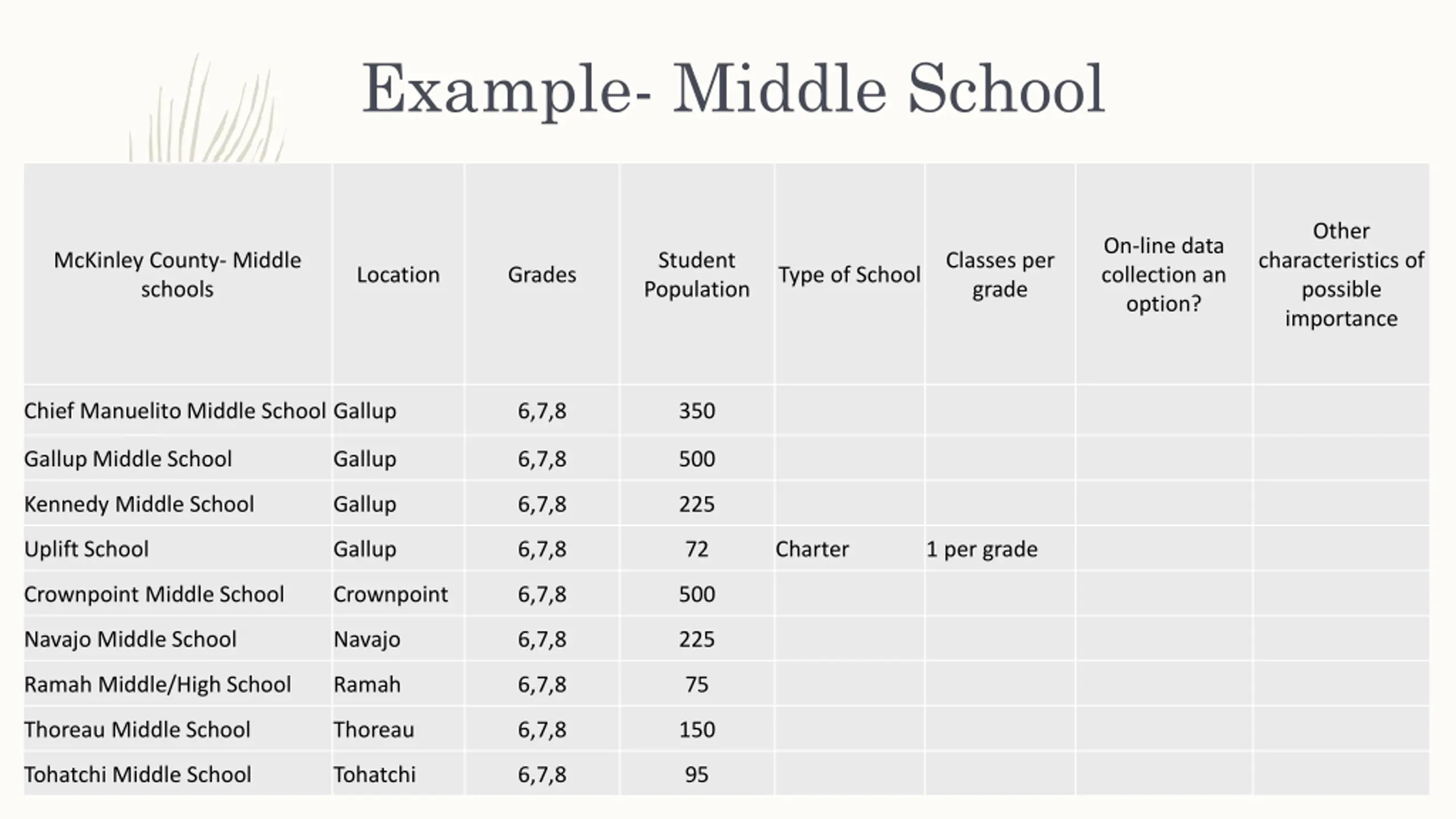 Example- Middle School Other On-line data collection an option? McKinley County- Middle schools Student Population Classes per grade characteristics of possible importance Location Grades Type of School Chief Manuelito Middle School Gallup 6,7,8 350 Gallup Middle School Gallup 6,7,8 500 Kennedy Middle School Gallup 6,7,8 225 Uplift School Gallup 6,7,8 72 Charter 1 per grade Crownpoint Middle School Crownpoint 6,7,8 500 Navajo Middle School Navajo 6,7,8 225 Ramah Middle/High School Ramah 6,7,8 75 Thoreau Middle School Thoreau 6,7,8 150 Tohatchi Middle School Tohatchi 6,7,8 95