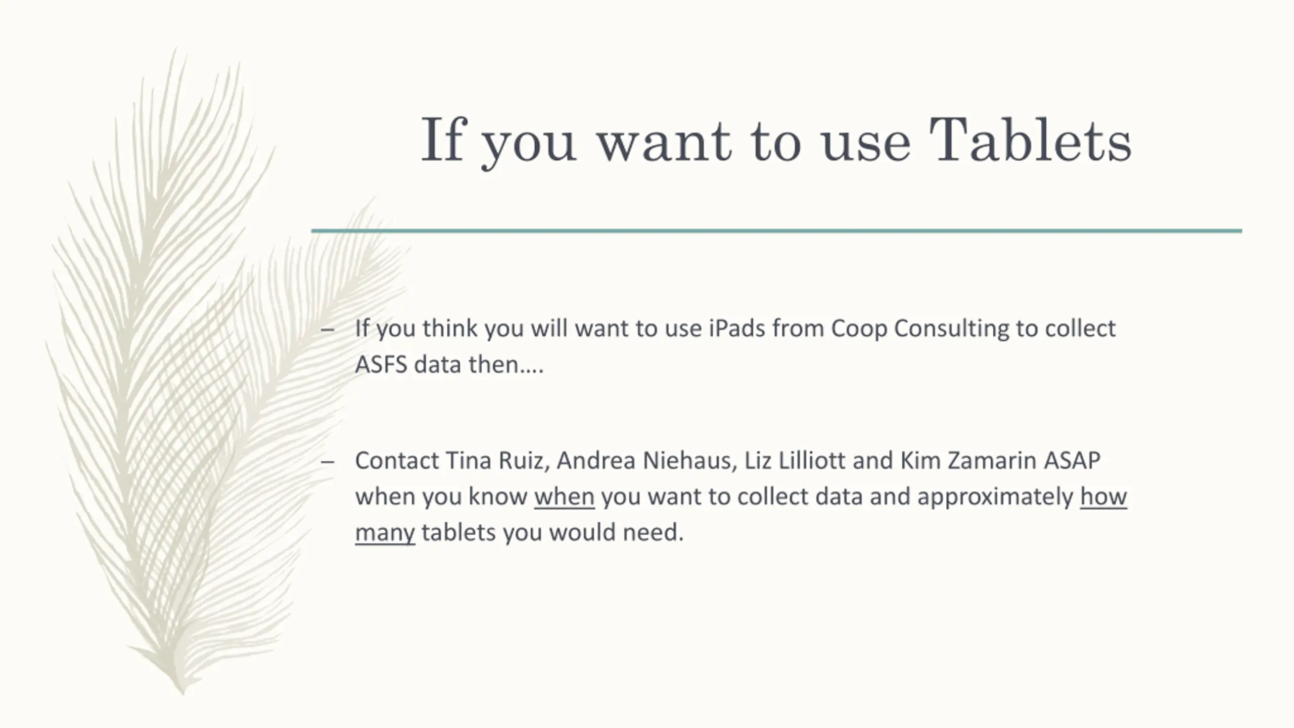 If you want to use Tablets If you think you will want to use iPads from Coop Consulting to collect ASFS data then . Contact Tina Ruiz, Andrea Niehaus, Liz Lilliott and Kim Zamarin ASAP when you know when you want to collect data and approximately how many tablets you would need.