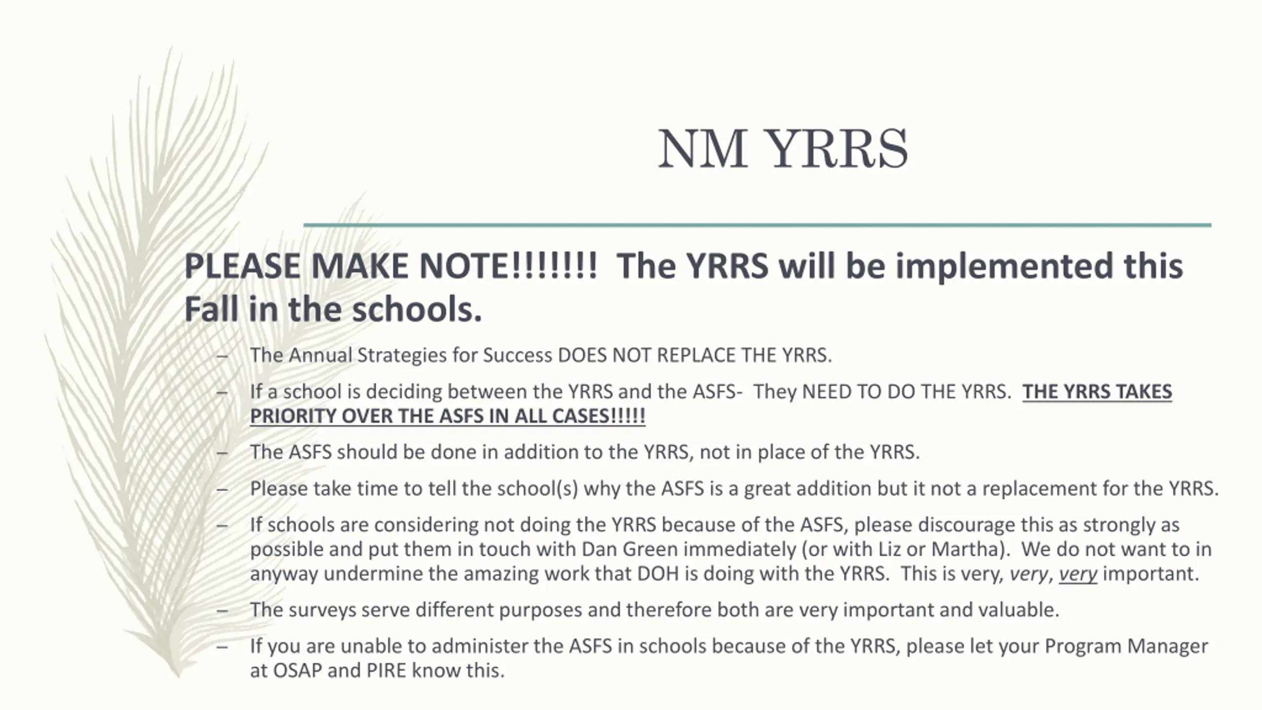 NM YRRS PLEASE MAKE NOTE!!!!!!! The YRRS will be implemented this Fall in the schools. The Annual Strategies for Success DOES NOT REPLACE THE YRRS. If a school is deciding between the YRRS and the ASFS- They NEED TO DO THE YRRS. THE YRRS TAKES PRIORITY OVER THE ASFS IN ALL CASES!!!!! The ASFS should be done in addition to the YRRS, not in place of the YRRS. Please take time to tell the school(s) why the ASFS is a great addition but it not a replacement for the YRRS. If schools are considering not doing the YRRS because of the ASFS, please discourage this as strongly as possible and put them in touch with Dan Green immediately (or with Liz or Martha). We do not want to in anyway undermine the amazing work that DOH is doing with the YRRS. This is very, very, very important. The surveys serve different purposes and therefore both are very important and valuable. If you are unable to administer the ASFS in schools because of the YRRS, please let your Program Manager at OSAP and PIRE know this.