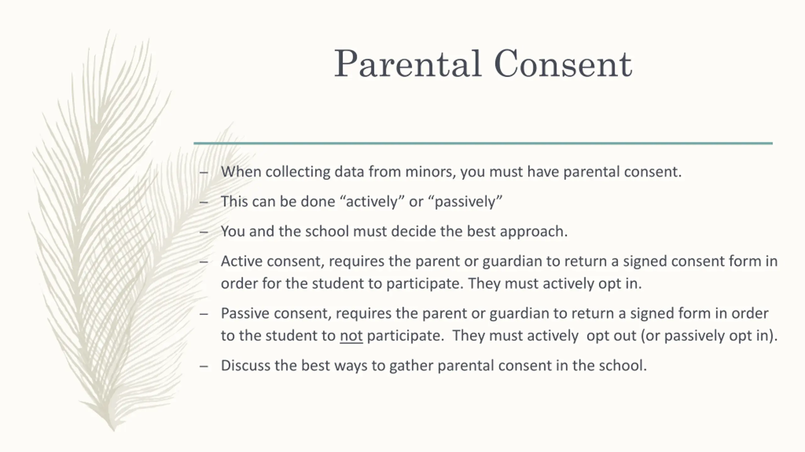 Parental Consent When collecting data from minors, you must have parental consent. This can be done actively or passively You and the school must decide the best approach. Active consent, requires the parent or guardian to return a signed consent form in order for the student to participate. They must actively opt in. Passive consent, requires the parent or guardian to return a signed form in order to the student to not participate. They must actively opt out (or passively opt in). Discuss the best ways to gather parental consent in the school.
