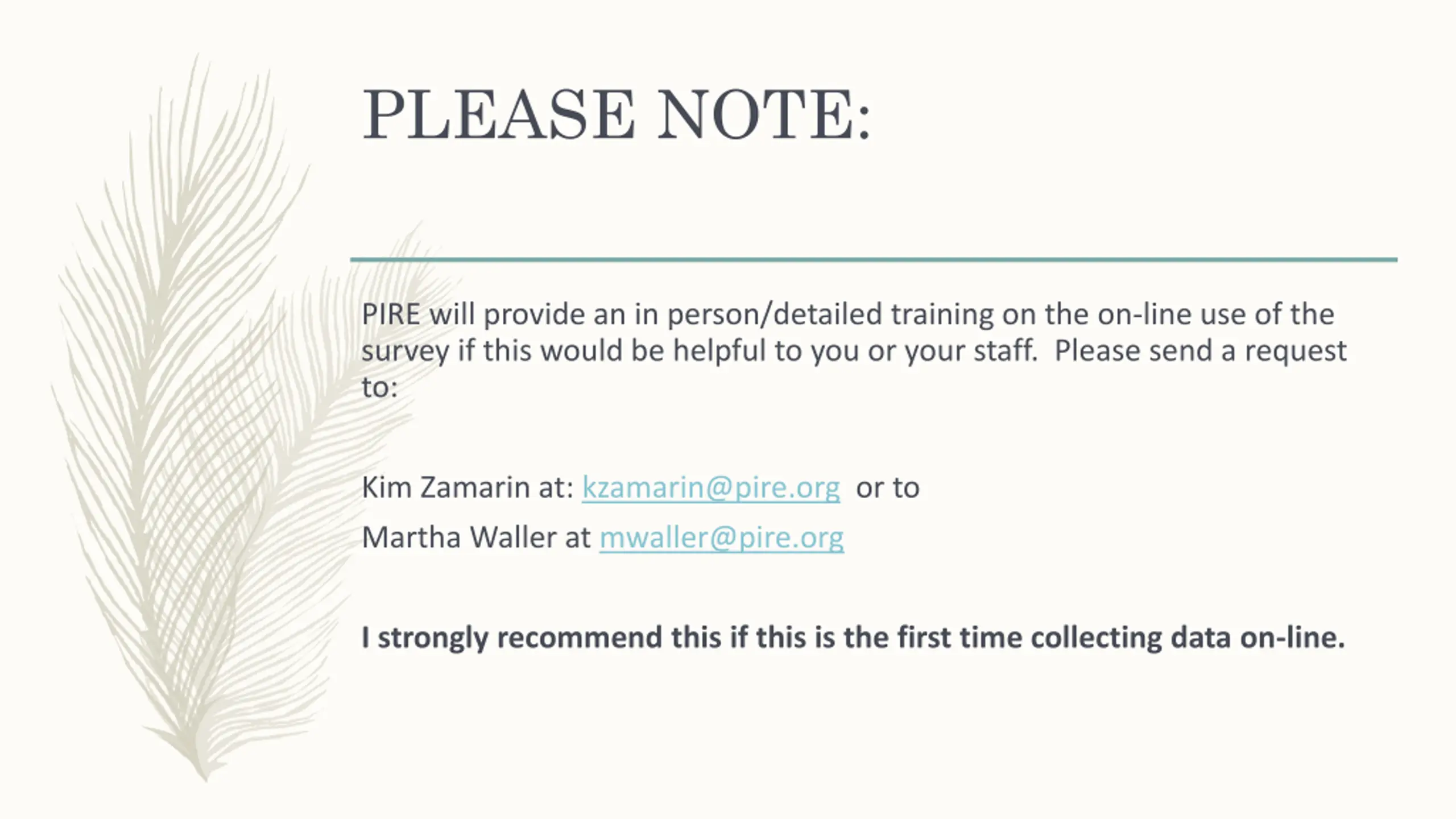 PLEASE NOTE: PIRE will provide an in person/detailed training on the on-line use of the survey if this would be helpful to you or your staff. Please send a request to: Kim Zamarin at: kzamarin@pire.org or to Martha Waller at mwaller@pire.org I strongly recommend this if this is the first time collecting data on-line.