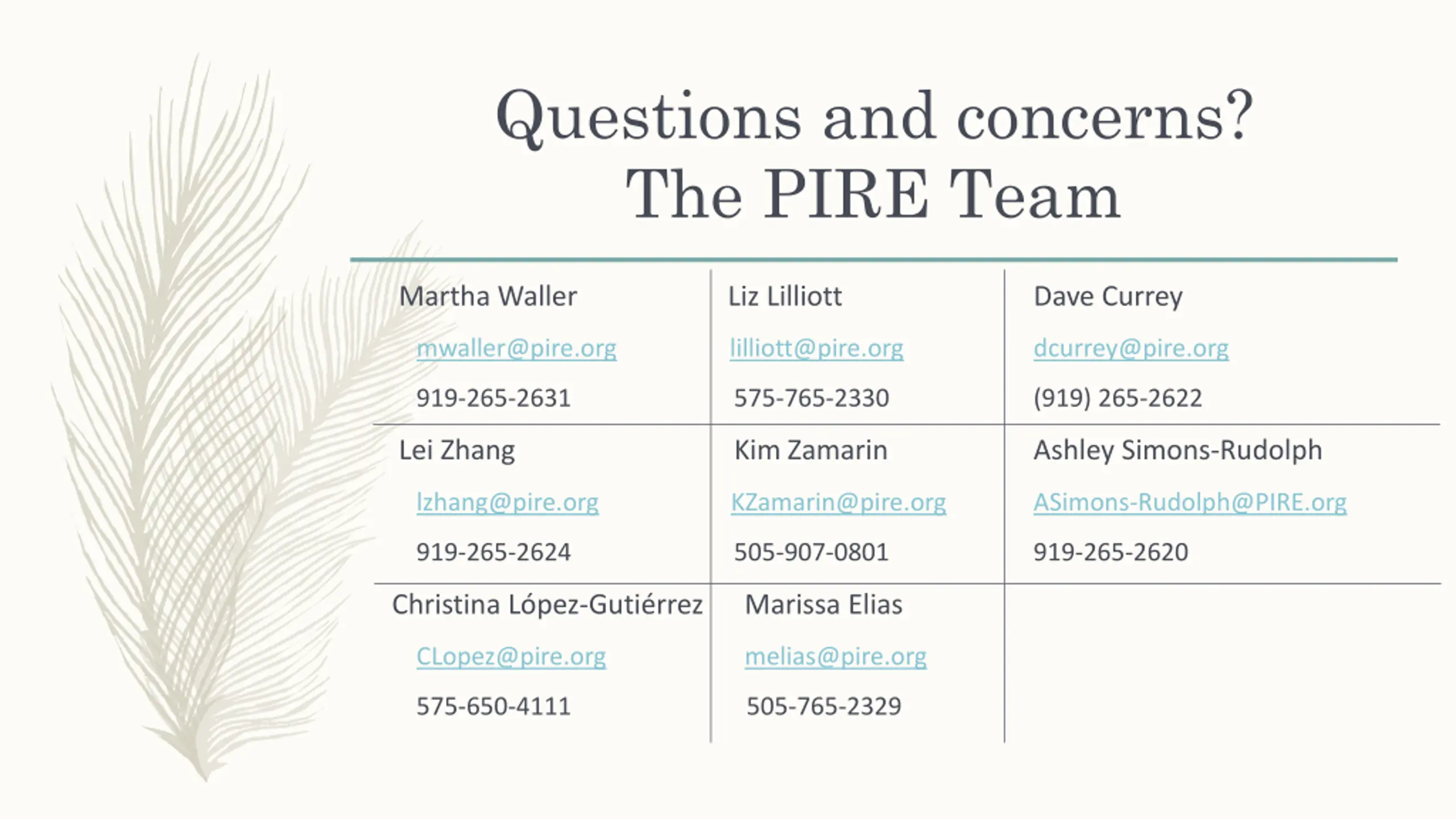 Questions and concerns? The PIRE Team Martha Waller Liz Lilliott Dave Currey mwaller@pire.org lilliott@pire.org dcurrey@pire.org 919-265-2631 575-765-2330 (919) 265-2622 Lei Zhang Kim Zamarin Ashley Simons-Rudolph lzhang@pire.org KZamarin@pire.org ASimons-Rudolph@PIRE.org 919-265-2624 505-907-0801 919-265-2620 Christina L pez-Guti rrez Marissa Elias CLopez@pire.org melias@pire.org 575-650-4111 505-765-2329