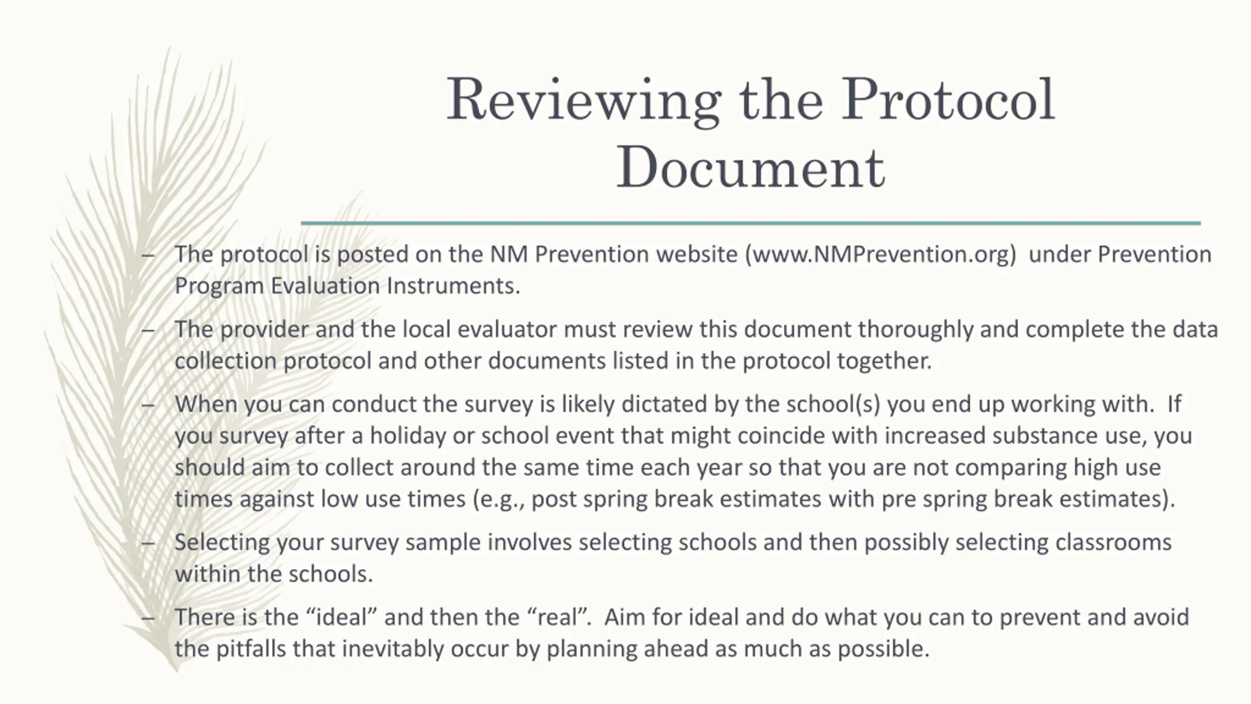 Reviewing the Protocol Document The protocol is posted on the NM Prevention website (www.NMPrevention.org) under Prevention Program Evaluation Instruments. The provider and the local evaluator must review this document thoroughly and complete the data collection protocol and other documents listed in the protocol together. When you can conduct the survey is likely dictated by the school(s) you end up working with. If you survey after a holiday or school event that might coincide with increased substance use, you should aim to collect around the same time each year so that you are not comparing high use times against low use times (e.g., post spring break estimates with pre spring break estimates). Selecting your survey sample involves selecting schools and then possibly selecting classrooms within the schools. There is the ideal and then the real . Aim for ideal and do what you can to prevent and avoid the pitfalls that inevitably occur by planning ahead as much as possible.