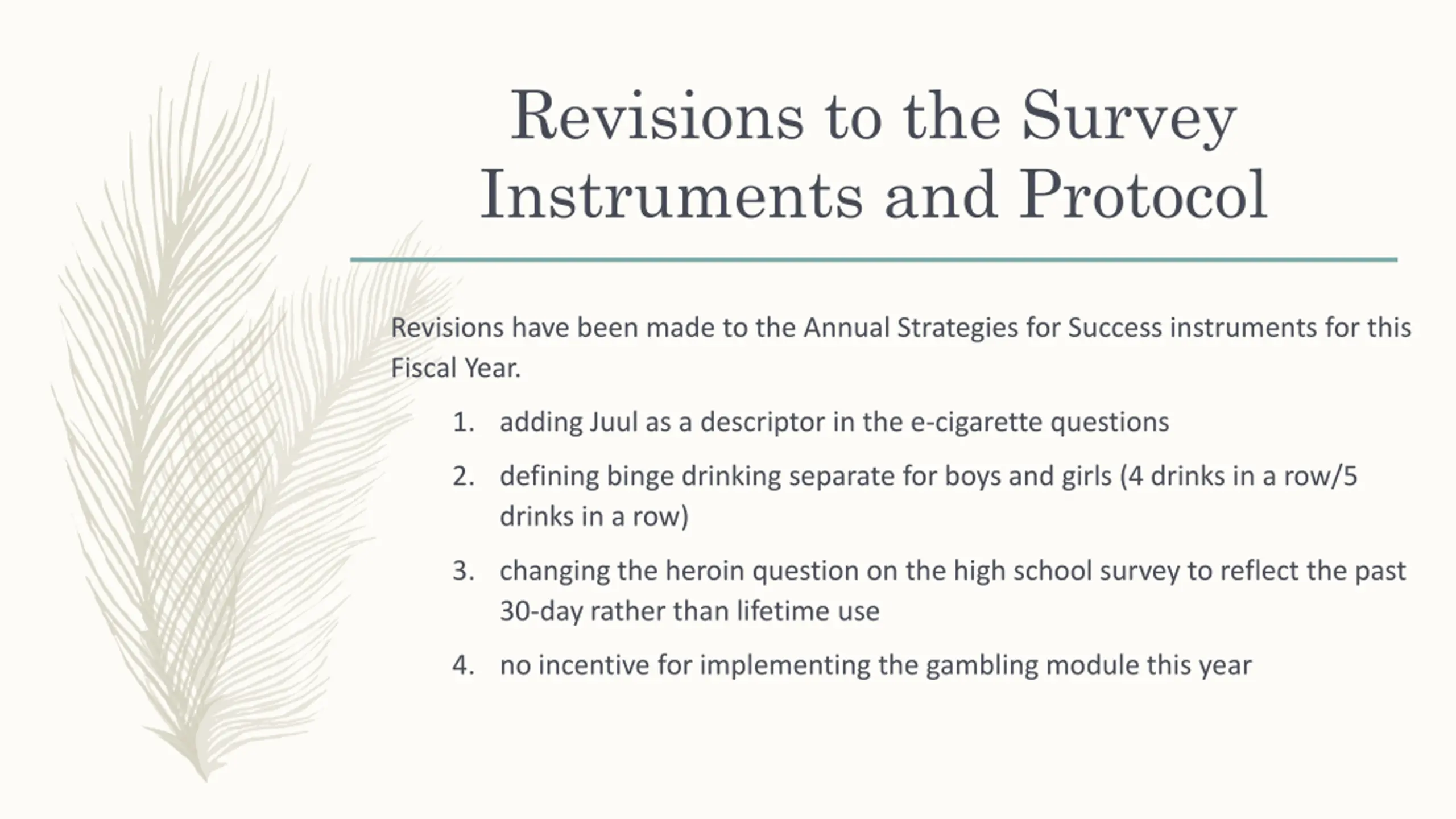 Revisions to the Survey Instruments and Protocol Revisions have been made to the Annual Strategies for Success instruments for this Fiscal Year. 1. adding Juul as a descriptor in the e-cigarette questions 2. defining binge drinking separate for boys and girls (4 drinks in a row/5 drinks in a row) 3. changing the heroin question on the high school survey to reflect the past 30-day rather than lifetime use 4. no incentive for implementing the gambling module this year