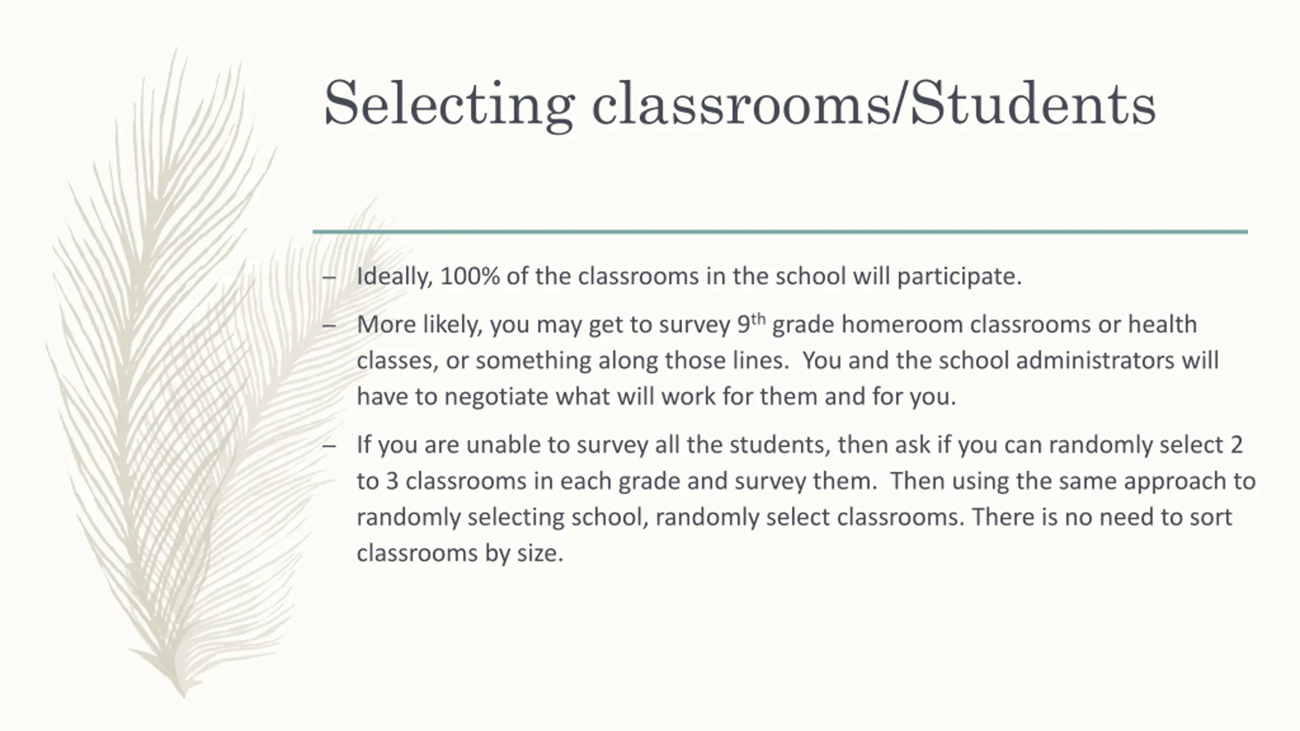 Selecting classrooms/Students Ideally, 100% of the classrooms in the school will participate. More likely, you may get to survey 9thgrade homeroom classrooms or health classes, or something along those lines. You and the school administrators will have to negotiate what will work for them and for you. If you are unable to survey all the students, then ask if you can randomly select 2 to 3 classrooms in each grade and survey them. Then using the same approach to randomly selecting school, randomly select classrooms. There is no need to sort classrooms by size.