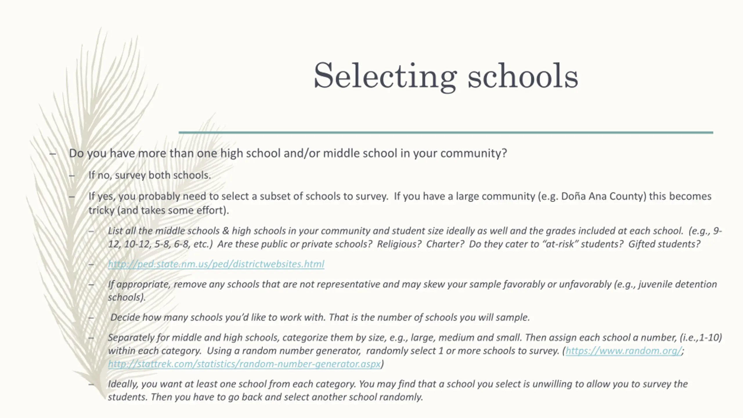 Selecting schools Do you have more than one high school and/or middle school in your community? If no, survey both schools. If yes, you probably need to select a subset of schools to survey. If you have a large community (e.g. Do a Ana County) this becomes tricky (and takes some effort). List all the middle schools & high schools in your community and student size ideally as well and the grades included at each school. (e.g., 9- 12, 10-12, 5-8, 6-8, etc.) Are these public or private schools? Religious? Charter? Do they cater to at-risk students? Gifted students? http://ped.state.nm.us/ped/districtwebsites.html If appropriate, remove any schools that are not representative and may skew your sample favorably or unfavorably (e.g., juvenile detention schools). Decide how many schools you d like to work with. That is the number of schools you will sample. Separately for middle and high schools, categorize them by size, e.g., large, medium and small. Then assign each school a number, (i.e.,1-10) within each category. Using a random number generator, randomly select 1 or more schools to survey. (https://www.random.org/; http://stattrek.com/statistics/random-number-generator.aspx) Ideally, you want at least one school from each category. You may find that a school you select is unwilling to allow you to survey the students. Then you have to go back and select another school randomly.