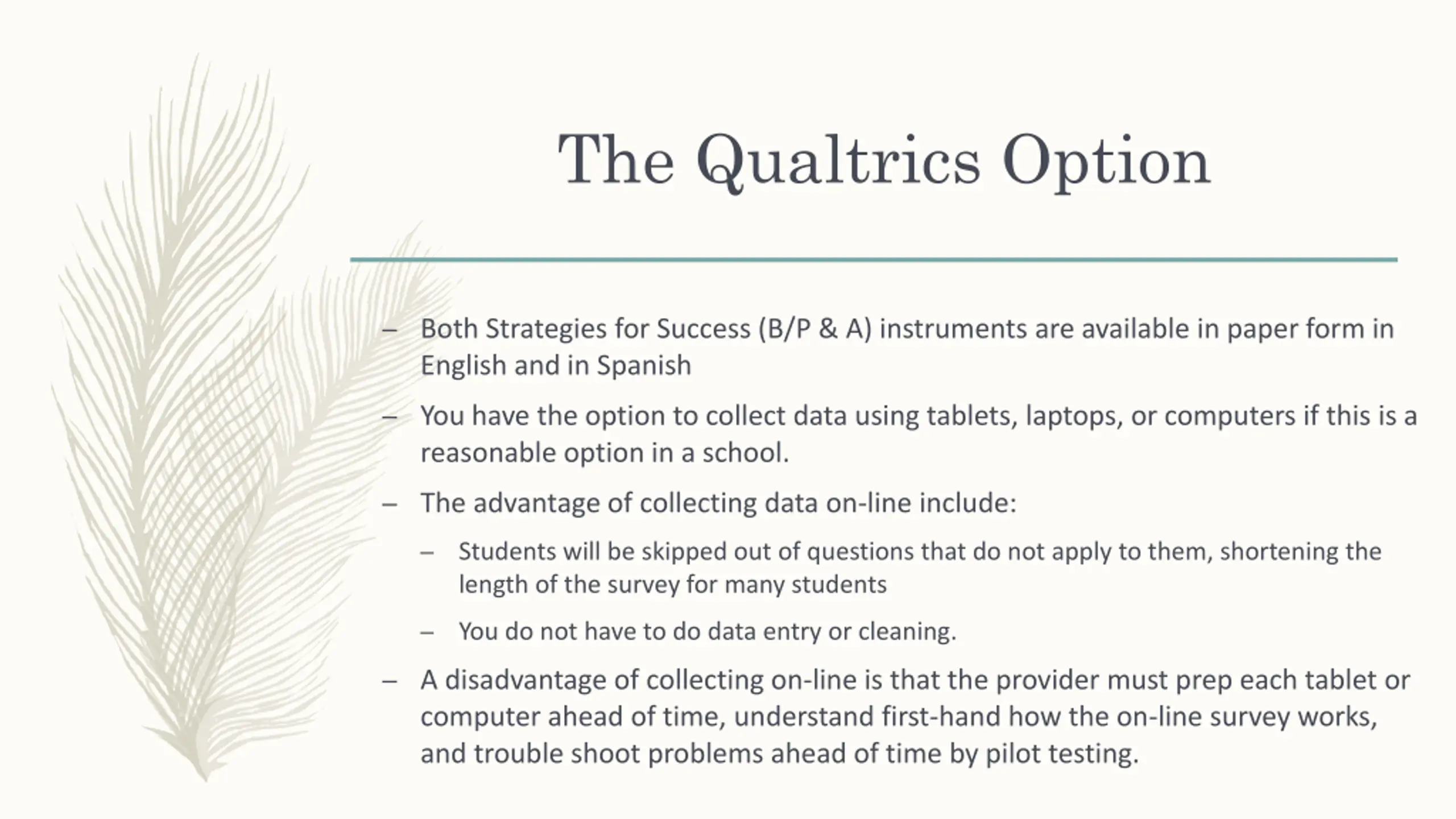 The Qualtrics Option Both Strategies for Success (B/P & A) instruments are available in paper form in English and in Spanish You have the option to collect data using tablets, laptops, or computers if this is a reasonable option in a school. The advantage of collecting data on-line include: Students will be skipped out of questions that do not apply to them, shortening the length of the survey for many students You do not have to do data entry or cleaning. A disadvantage of collecting on-line is that the provider must prep each tablet or computer ahead of time, understand first-hand how the on-line survey works, and trouble shoot problems ahead of time by pilot testing.