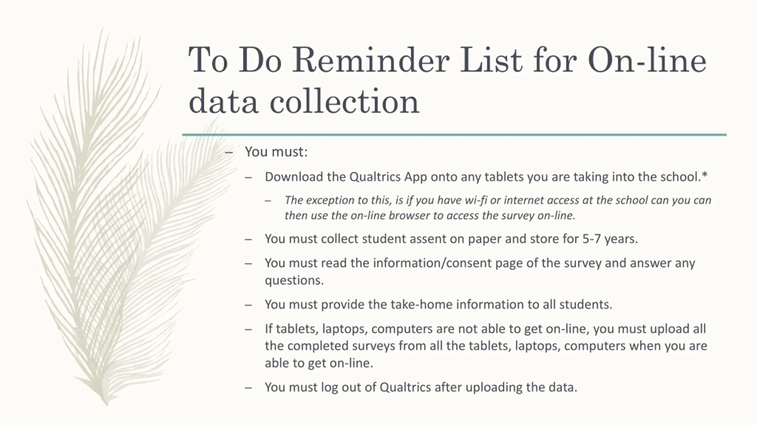 To Do Reminder List for On-line data collection You must: Download the Qualtrics App onto any tablets you are taking into the school.* The exception to this, is if you have wi-fi or internet access at the school can you can then use the on-line browser to access the survey on-line. You must collect student assent on paper and store for 5-7 years. You must read the information/consent page of the survey and answer any questions. You must provide the take-home information to all students. If tablets, laptops, computers are not able to get on-line, you must upload all the completed surveys from all the tablets, laptops, computers when you are able to get on-line. You must log out of Qualtrics after uploading the data.