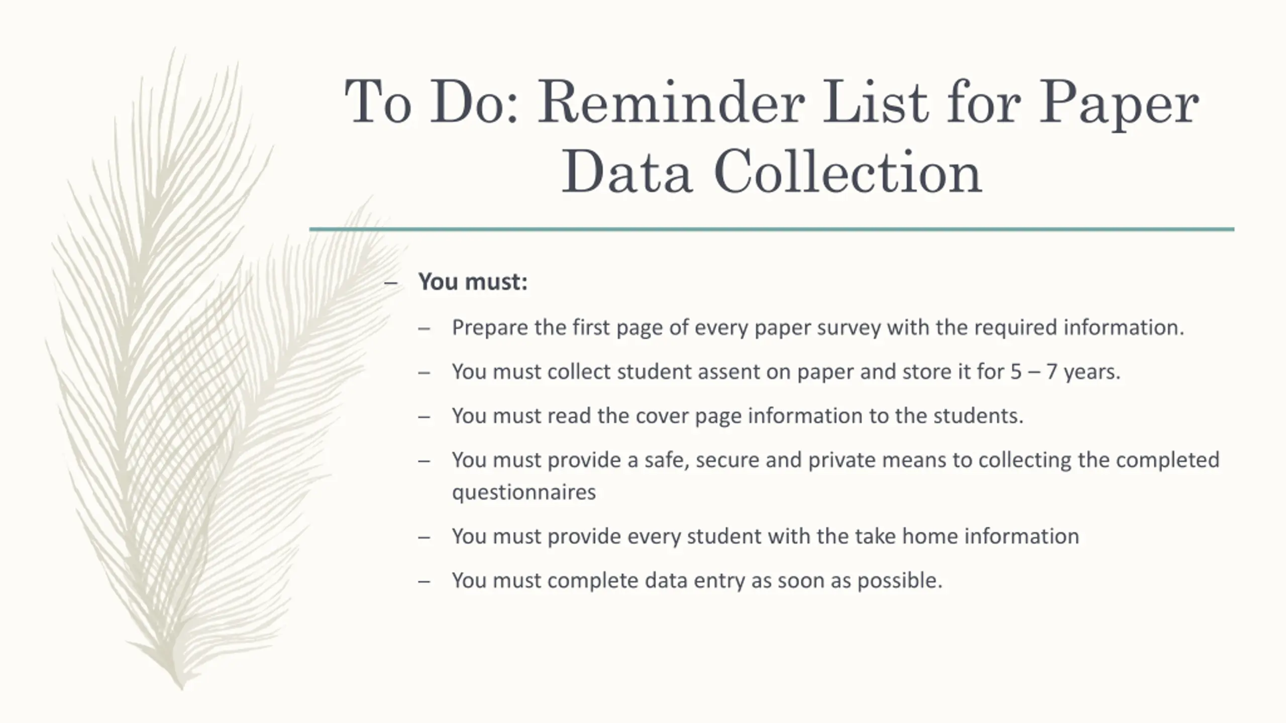 To Do: Reminder List for Paper Data Collection You must: Prepare the first page of every paper survey with the required information. You must collect student assent on paper and store it for 5 7 years. You must read the cover page information to the students. You must provide a safe, secure and private means to collecting the completed questionnaires You must provide every student with the take home information You must complete data entry as soon as possible.