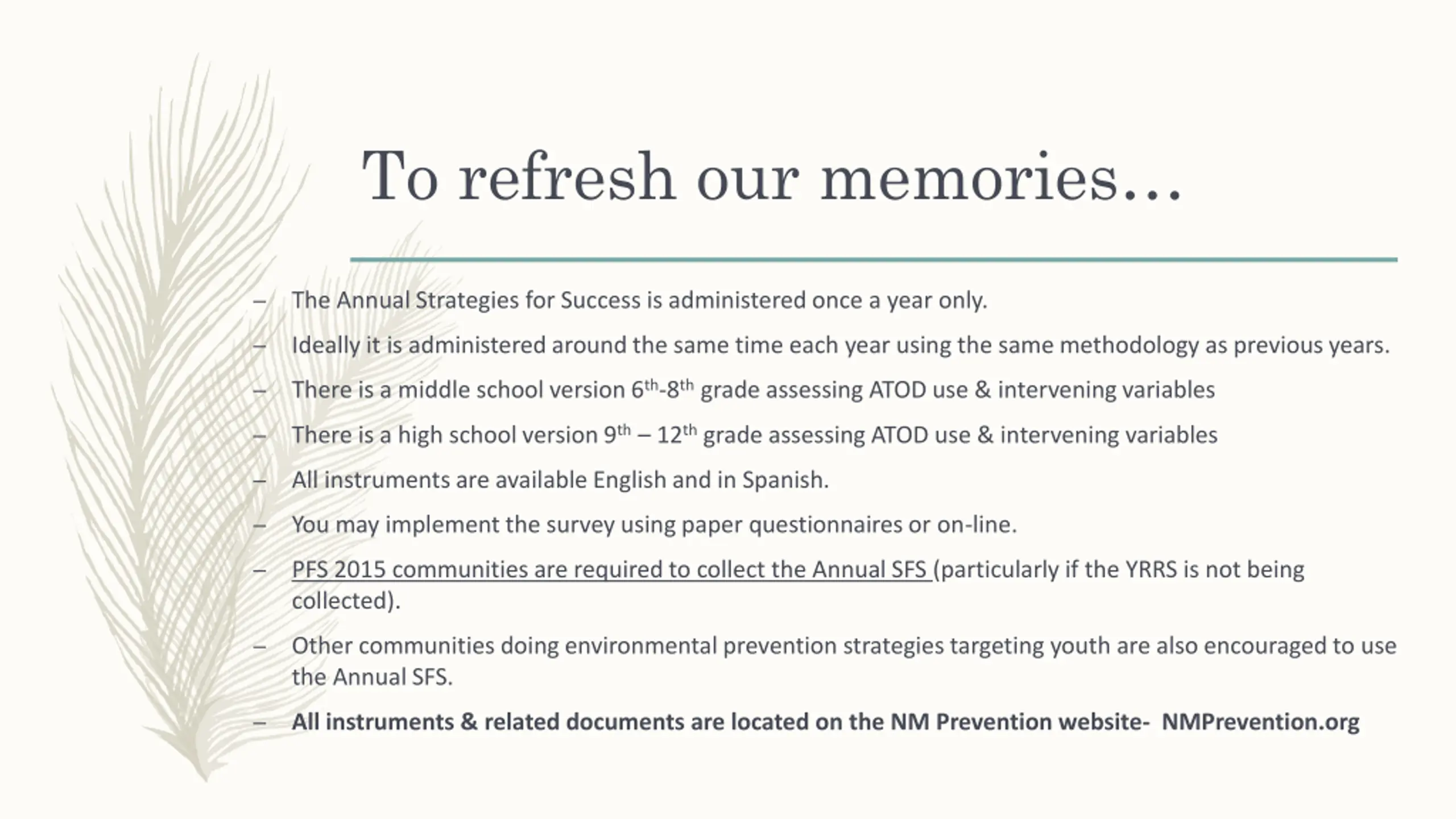To refresh our memories The Annual Strategies for Success is administered once a year only. Ideally it is administered around the same time each year using the same methodology as previous years. There is a middle school version 6th-8thgrade assessing ATOD use & intervening variables There is a high school version 9th 12thgrade assessing ATOD use & intervening variables All instruments are available English and in Spanish. You may implement the survey using paper questionnaires or on-line. PFS 2015 communities are required to collect the Annual SFS (particularly if the YRRS is not being collected). Other communities doing environmental prevention strategies targeting youth are also encouraged to use the Annual SFS. All instruments & related documents are located on the NM Prevention website- NMPrevention.org