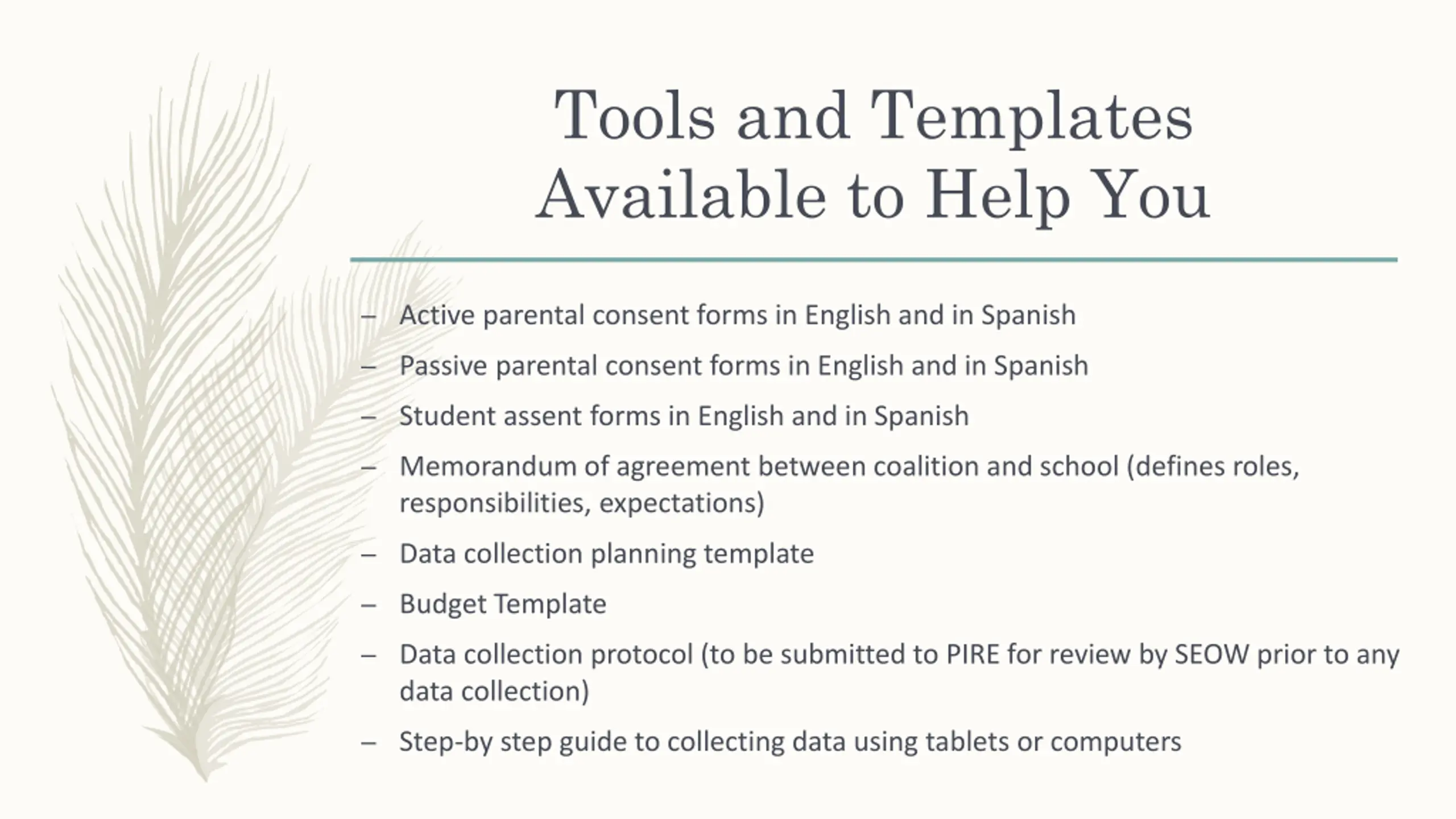 Tools and Templates Available to Help You Active parental consent forms in English and in Spanish Passive parental consent forms in English and in Spanish Student assent forms in English and in Spanish Memorandum of agreement between coalition and school (defines roles, responsibilities, expectations) Data collection planning template Budget Template Data collection protocol (to be submitted to PIRE for review by SEOW prior to any data collection) Step-by step guide to collecting data using tablets or computers