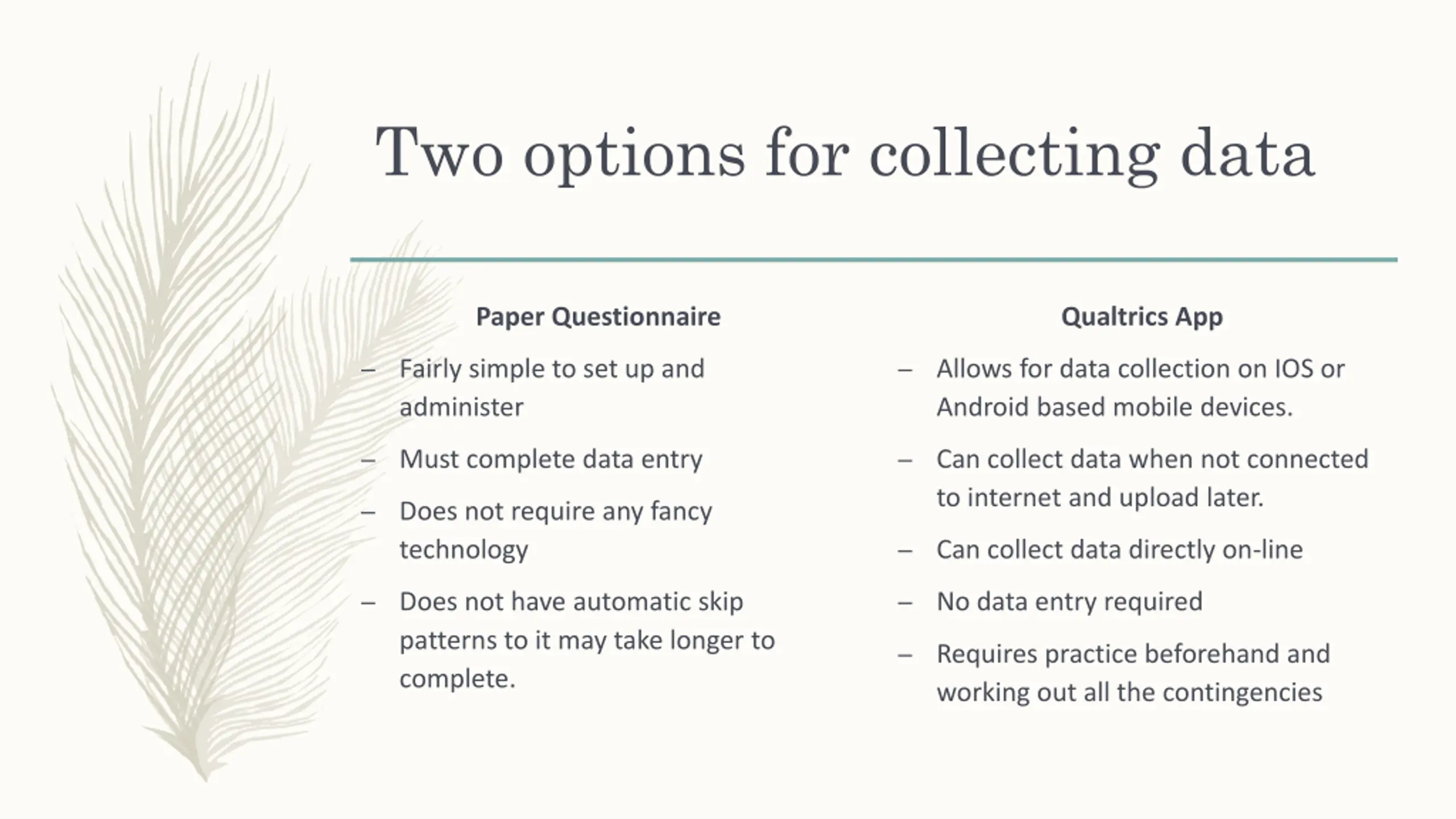 Two options for collecting data Paper Questionnaire Qualtrics App Fairly simple to set up and administer Allows for data collection on IOS or Android based mobile devices. Must complete data entry Can collect data when not connected to internet and upload later. Does not require any fancy technology Can collect data directly on-line Does not have automatic skip patterns to it may take longer to complete. No data entry required Requires practice beforehand and working out all the contingencies