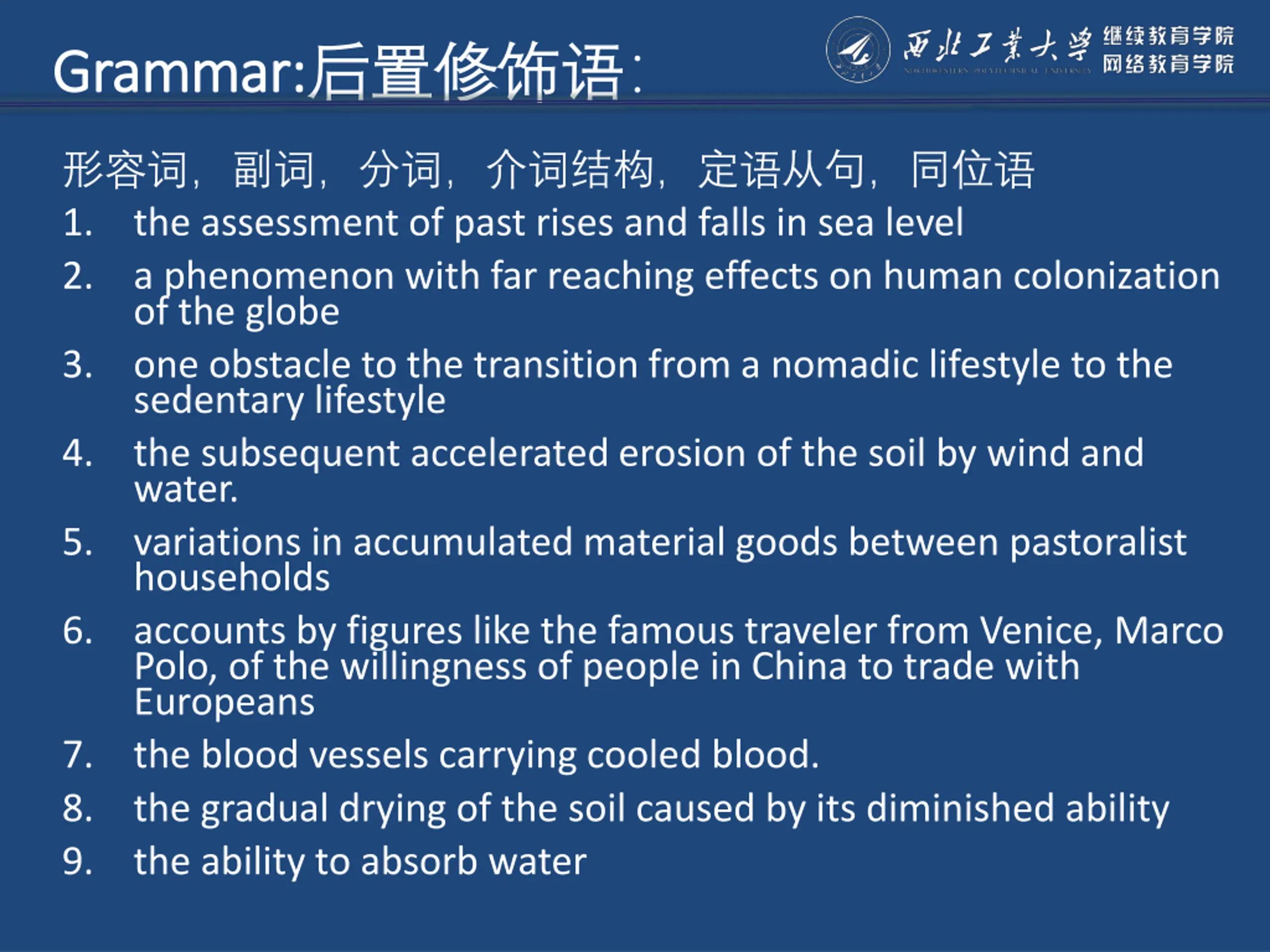 Grammar: Grammar: 1. the assessment of past rises and falls in sea level 2. a phenomenon with far reaching effects on human colonization of the globe 3. one obstacle to the transition from a nomadic lifestyle to the sedentary lifestyle 4. the subsequent accelerated erosion of the soil by wind and water. 5. variations in accumulated material goods between pastoralist households 6. accounts by figures like the famous traveler from Venice, Marco Polo, of the willingness of people in China to trade with Europeans 7. the blood vessels carrying cooled blood. 8. the gradual drying of the soil caused by its diminished ability 9. the ability to absorb water