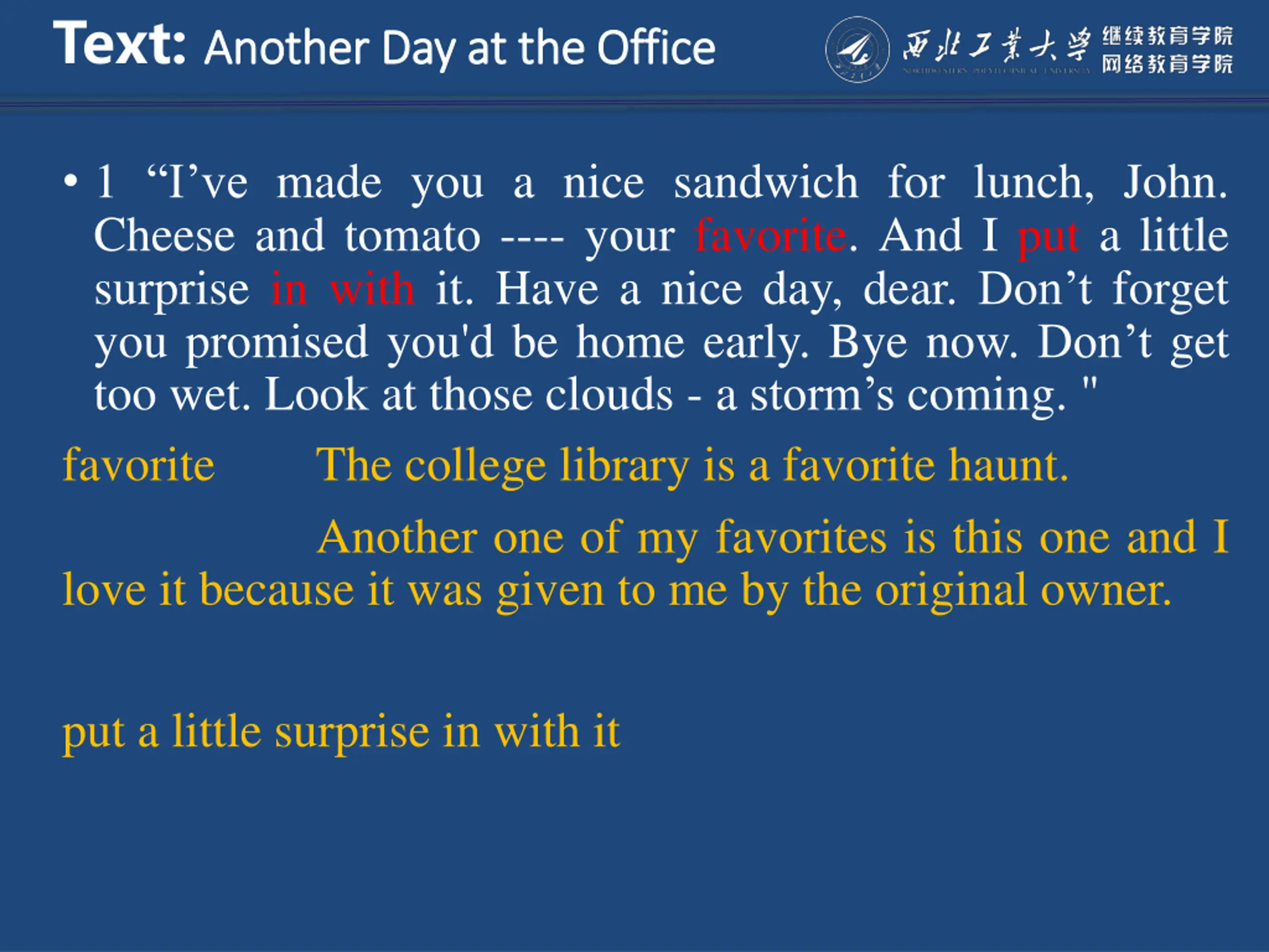 Text: Another Day at the Office Another Day at the Office 1 I ve made you a nice sandwich for lunch, John. Cheese and tomato ---- your favorite. And I put a little surprise in with it. Have a nice day, dear. Don t forget you promised you'd be home early. Bye now. Don t get too wet. Look at those clouds - a storm s coming. " favorite The college library is a favorite haunt. Another one of my favorites is this one and I love it because it was given to me by the original owner. put a little surprise in with it
