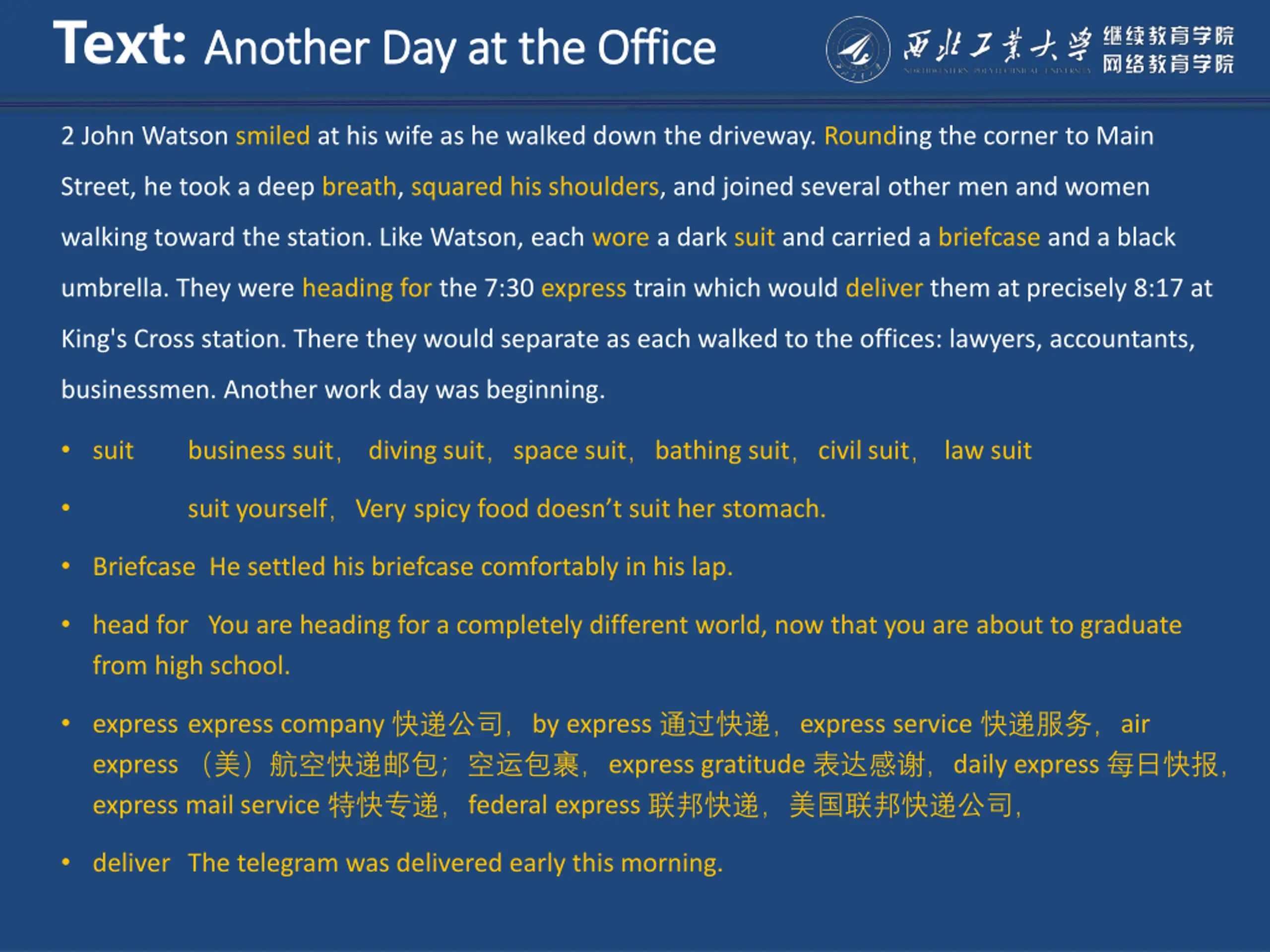 Text: Another Day at the Office Another Day at the Office 2 John Watson smiled at his wife as he walked down the driveway. Rounding the corner to Main Street, he took a deep breath, squared his shoulders, and joined several other men and women walking toward the station. Like Watson, each wore a dark suit and carried a briefcase and a black umbrella. They were heading for the 7:30 express train which would deliver them at precisely 8:17 at King's Cross station. There they would separate as each walked to the offices: lawyers, accountants, businessmen. Another work day was beginning. suit business suit diving suit space suit bathing suit civil suit law suit suit yourself Very spicy food doesn t suit her stomach. Briefcase He settled his briefcase comfortably in his lap. head for You are heading for a completely different world, now that you are about to graduate from high school. express express company by express express service air express express gratitude daily express express mail service federal express deliver The telegram was delivered early this morning.