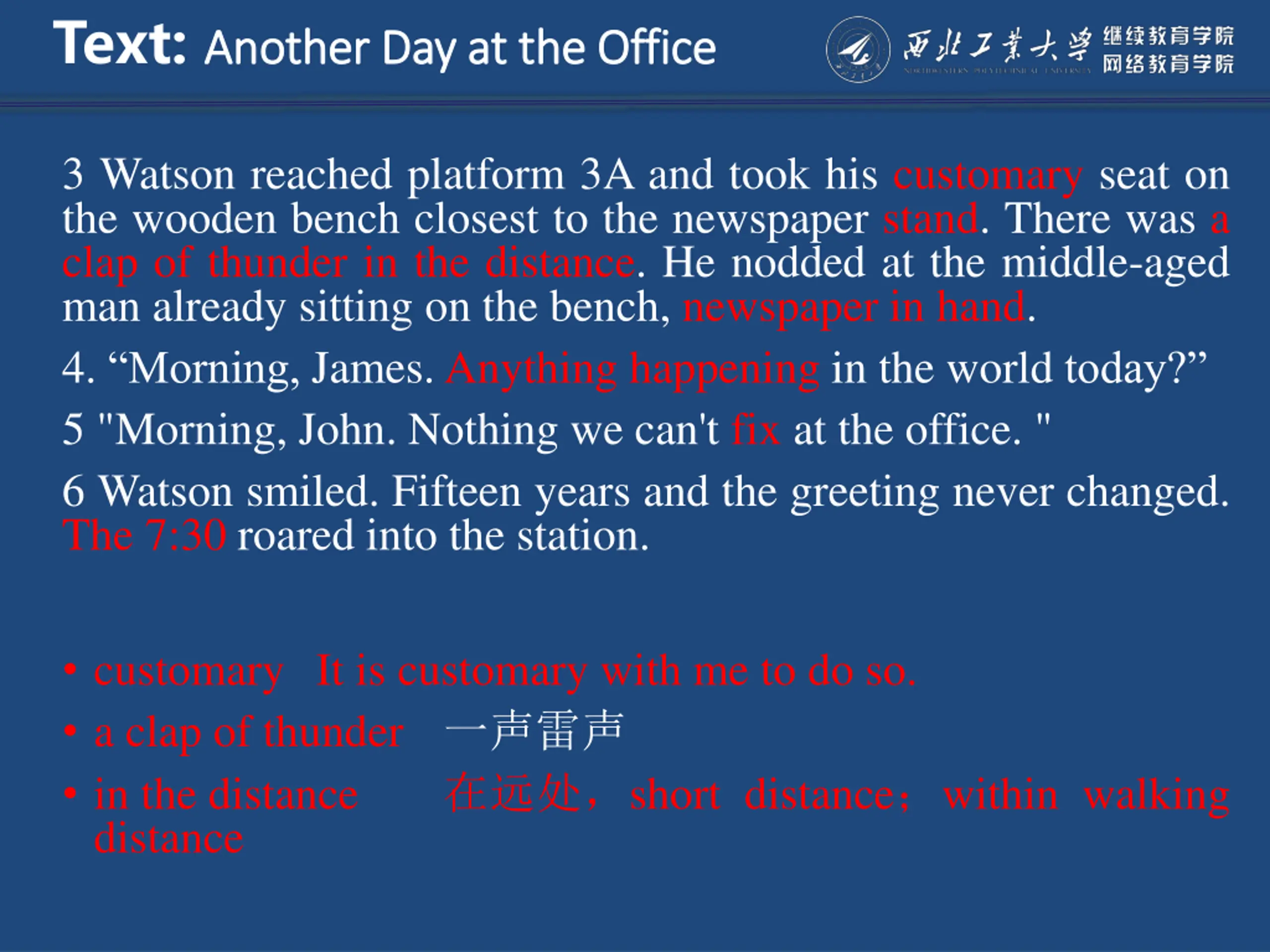 Text: Another Day at the Office Another Day at the Office 3 Watson reached platform 3A and took his customary seat on the wooden bench closest to the newspaper stand. There was a clap of thunder in the distance. He nodded at the middle-aged man already sitting on the bench, newspaper in hand. 4. Morning, James. Anything happening in the world today? 5 "Morning, John. Nothing we can't fix at the office. " 6 Watson smiled. Fifteen years and the greeting never changed. The 7:30 roared into the station. customary It is customary with me to do so. a clap of thunder in the distance short distance within walking distance