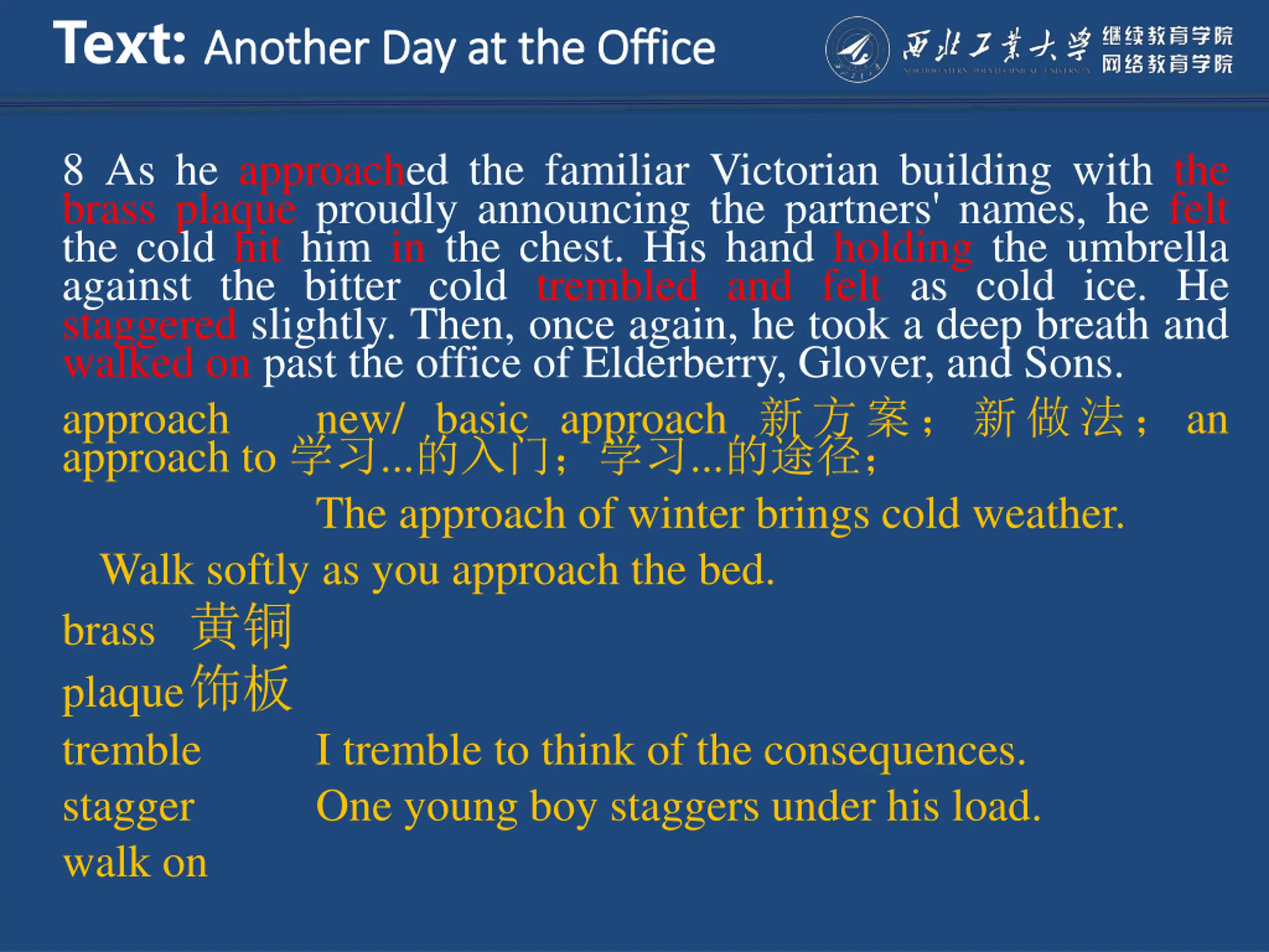 Text: Another Day at the Office Another Day at the Office 8 As he approached the familiar Victorian building with the brass plaque proudly announcing the partners' names, he felt the cold hit him in the chest. His hand holding the umbrella against the bitter cold trembled and felt as cold ice. He staggered slightly. Then, once again, he took a deep breath and walked on past the office of Elderberry, Glover, and Sons. approach new/ basic approach an approach to ... ... The approach of winter brings cold weather. Walk softly as you approach the bed. brass plaque tremble I tremble to think of the consequences. stagger One young boy staggers under his load. walk on