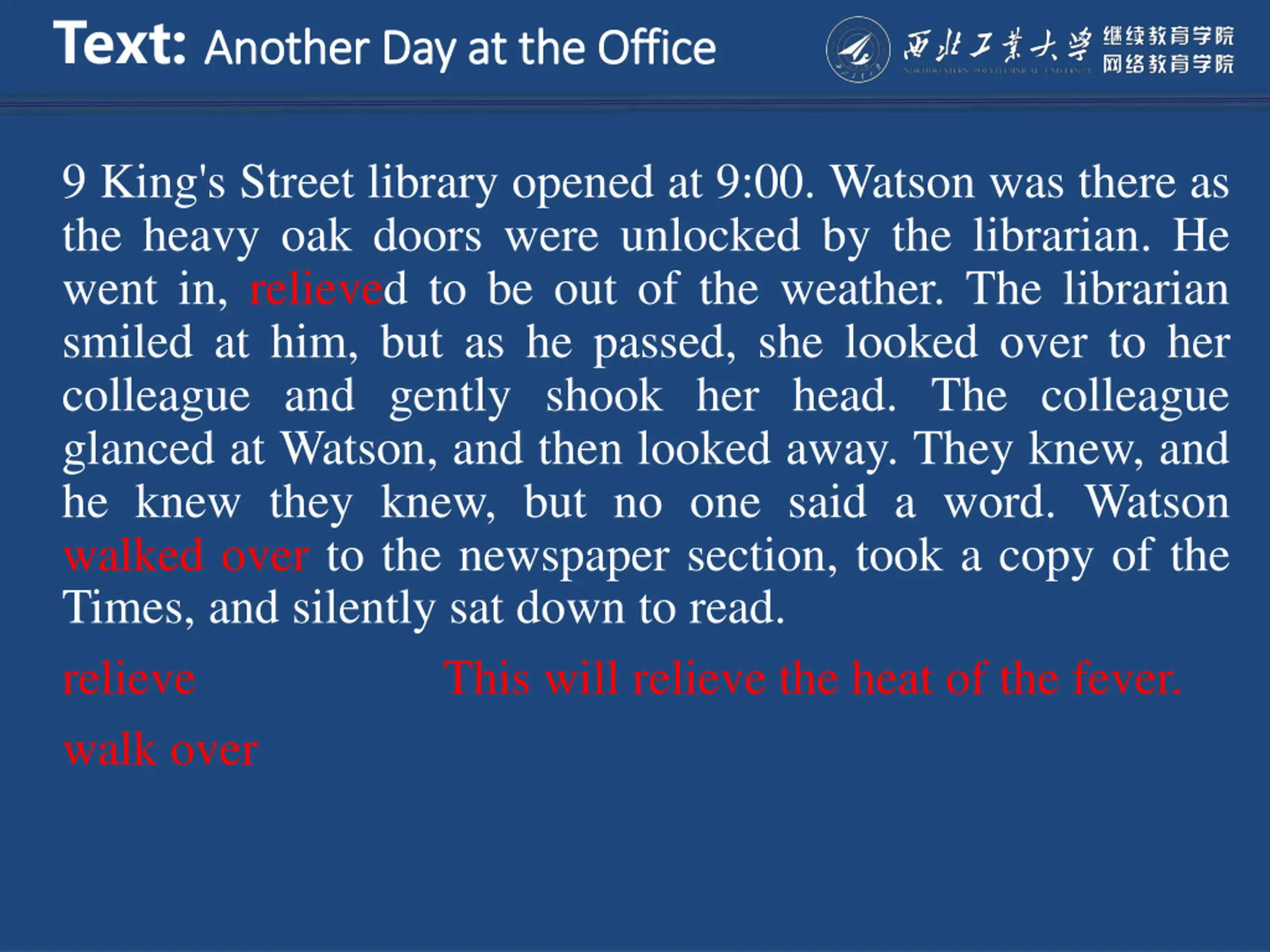 Text: Another Day at the Office Another Day at the Office 9 King's Street library opened at 9:00. Watson was there as the heavy oak doors were unlocked by the librarian. He went in, relieved to be out of the weather. The librarian smiled at him, but as he passed, she looked over to her colleague and gently shook her head. The colleague glanced at Watson, and then looked away. They knew, and he knew they knew, but no one said a word. Watson walked over to the newspaper section, took a copy of the Times, and silently sat down to read. relieve This will relieve the heat of the fever. walk over