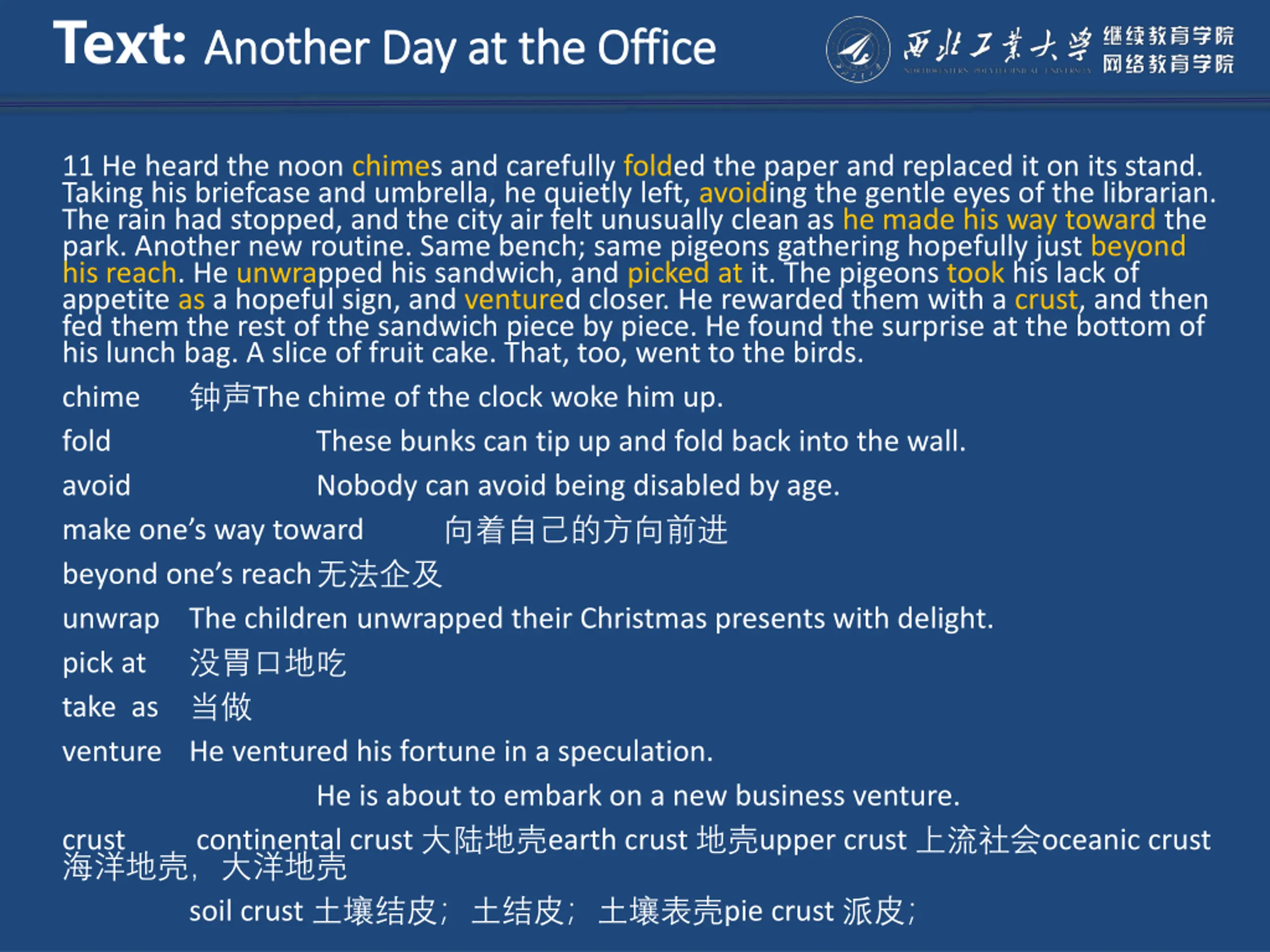 Text: Another Day at the Office Another Day at the Office 11 He heard the noon chimes and carefully folded the paper and replaced it on its stand. Taking his briefcase and umbrella, he quietly left, avoiding the gentle eyes of the librarian. The rain had stopped, and the city air felt unusually clean as he made his way toward the park. Another new routine. Same bench; same pigeons gathering hopefully just beyond his reach. He unwrapped his sandwich, and picked at it. The pigeons took his lack of appetite as a hopeful sign, and ventured closer. He rewarded them with a crust, and then fed them the rest of the sandwich piece by piece. He found the surprise at the bottom of his lunch bag. A slice of fruit cake. That, too, went to the birds. chime The chime of the clock woke him up. fold These bunks can tip up and fold back into the wall. avoid Nobody can avoid being disabled by age. make one s way toward beyond one s reach unwrap The children unwrapped their Christmas presents with delight. pick at take as venture He ventured his fortune in a speculation. He is about to embark on a new business venture. crust continental crust earth crust upper crust oceanic crust soil crust pie crust
