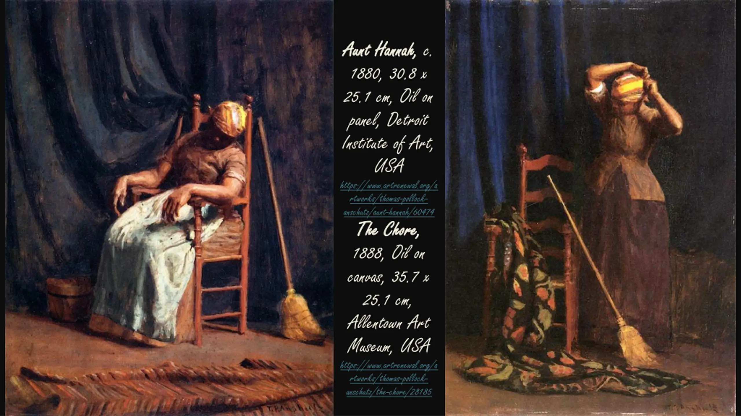 Aunt Hannah, Aunt Hannah, c. 1880, 30.8 x 25.1 cm, Oil on panel, Detroit Institute of Art, USA https://www.artrenewal.org/a rtworks/thomas-pollock- anschutz/aunt-hannah/60474 The Chore, The Chore, 1888, Oil on canvas, 35.7 x 25.1 cm, Allentown Art Museum, USA https://www.artrenewal.org/a rtworks/thomas-pollock- anschutz/the-chore/28185