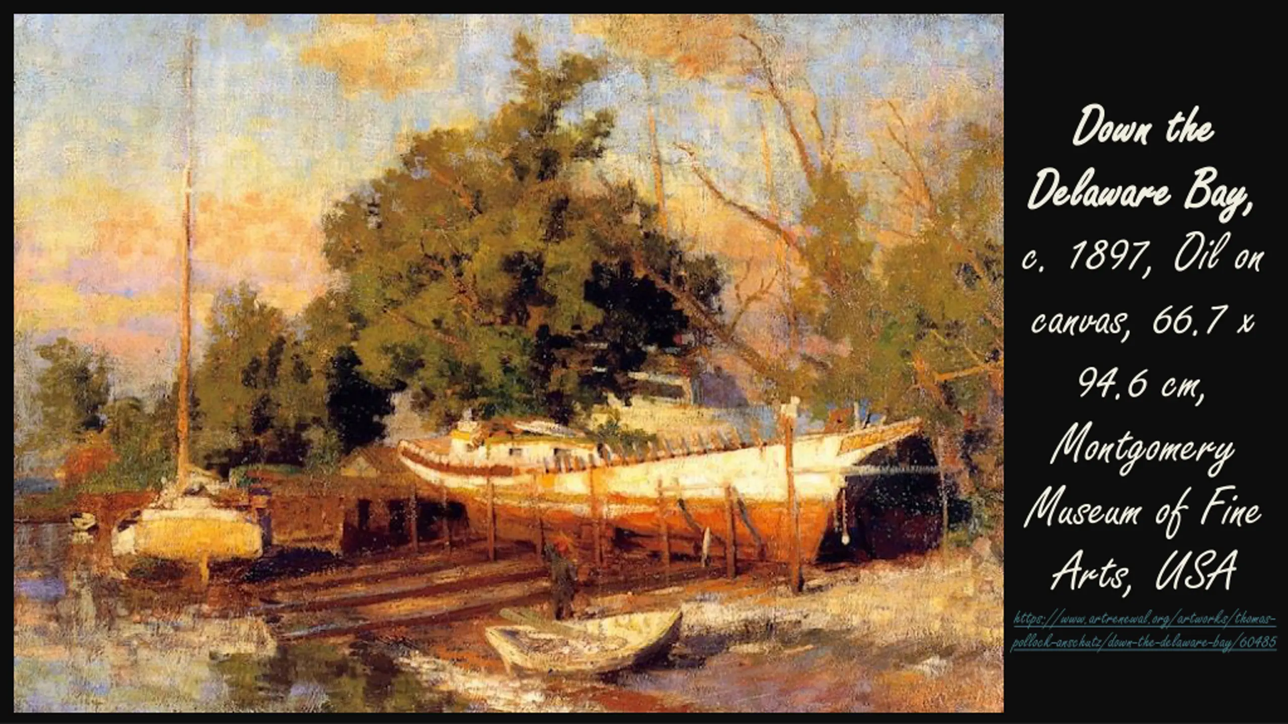 Down the Down the Delaware Bay, Delaware Bay, c. 1897, Oil on canvas, 66.7 x 94.6 cm, Montgomery Museum of Fine Arts, USA https://www.artrenewal.org/artworks/thomas- pollock-anschutz/down-the-delaware-bay/60485