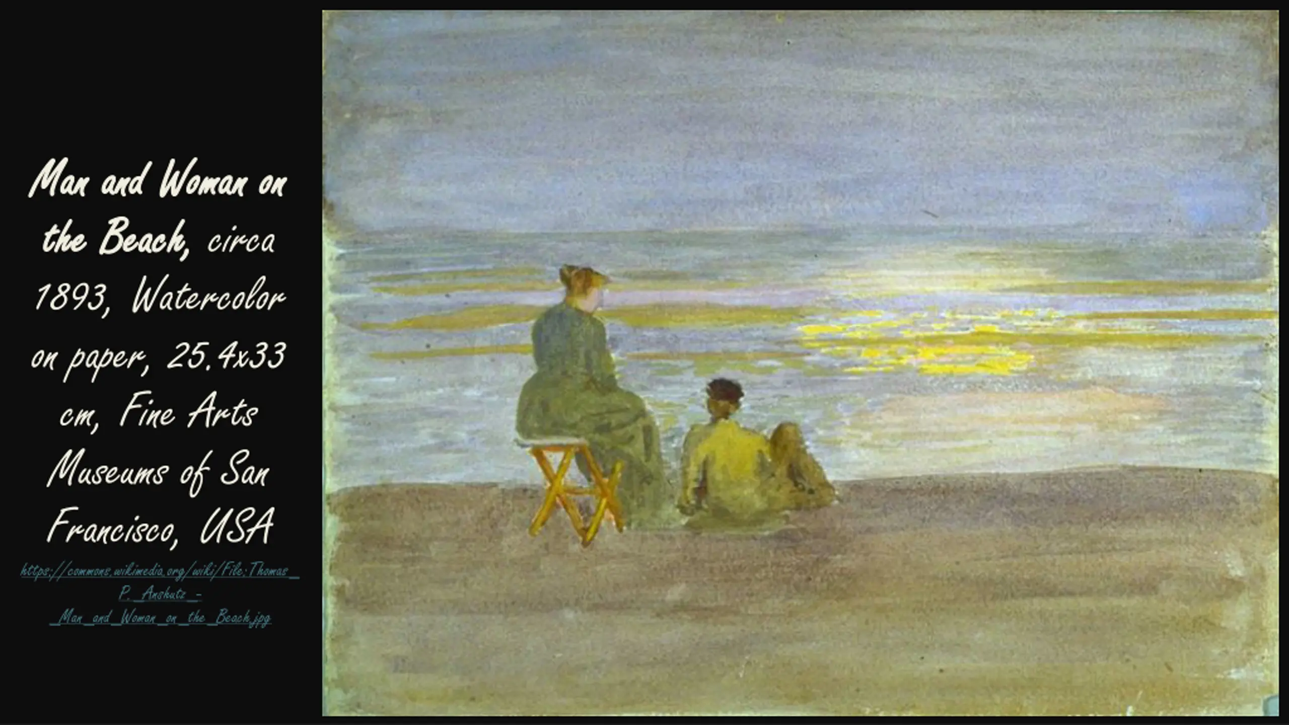 Man and Woman on Man and Woman on the Beach, the Beach, circa 1893, Watercolor on paper, 25.4x33 cm, Fine Arts Museums of San Francisco, USA https://commons.wikimedia.org/wiki/File:Thomas_ P._Anshutz_- _Man_and_Woman_on_the_Beach.jpg