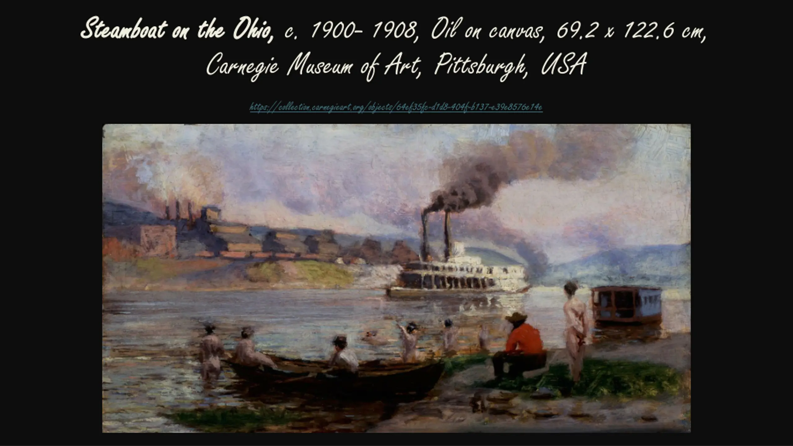 Steamboat on the Ohio, Steamboat on the Ohio, c. 1900- 1908, Oil on canvas, 69.2 x 122.6 cm, Carnegie Museum of Art, Pittsburgh, USA https://collection.carnegieart.org/objects/64ef35fc-d1d8-404f-b137-e39e8576e14e