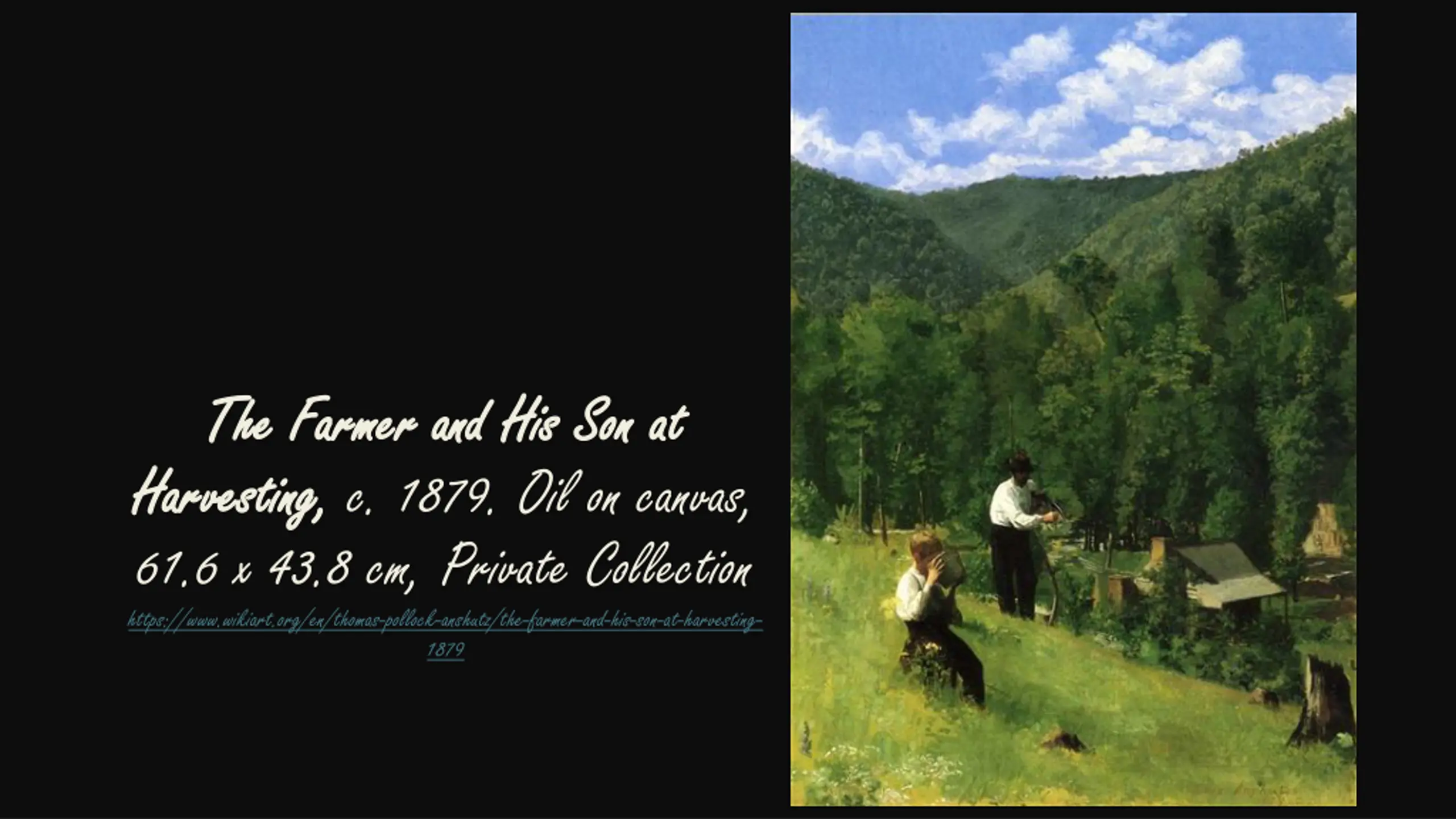 The Farmer and His Son at The Farmer and His Son at Harvesting, Harvesting, c. 1879. Oil on canvas, 61.6 x 43.8 cm, Private Collection https://www.wikiart.org/en/thomas-pollock-anshutz/the-farmer-and-his-son-at-harvesting- 1879