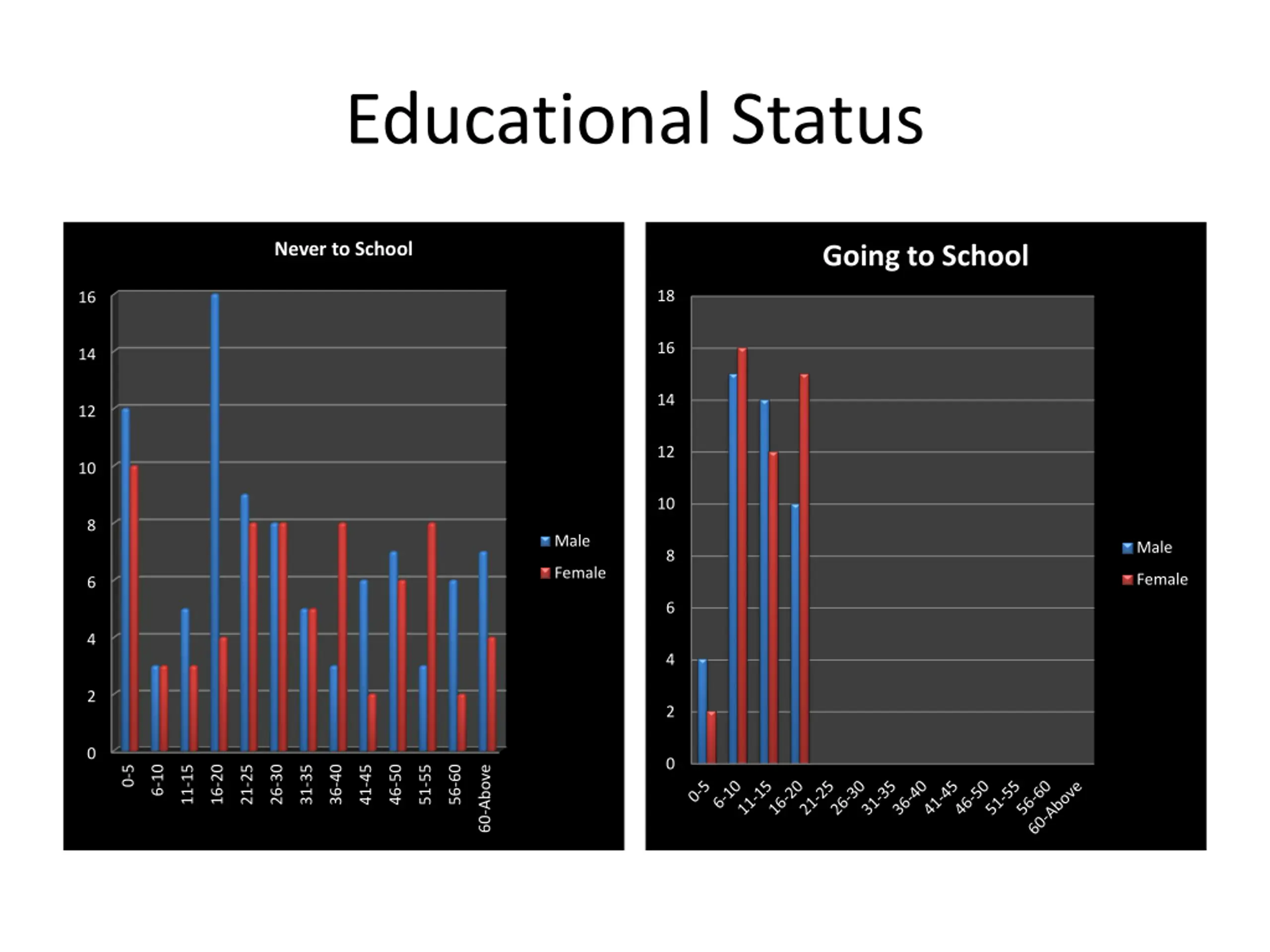 Educational Status Never to School Going to School 18 16 16 14 14 12 12 10 10 8 Male Male 8 Female Female 6 6 4 4 2 2 0 0 0-5 60-Above 6-10 11-15 16-20 21-25 26-30 31-35 36-40 41-45 46-50 51-55 56-60