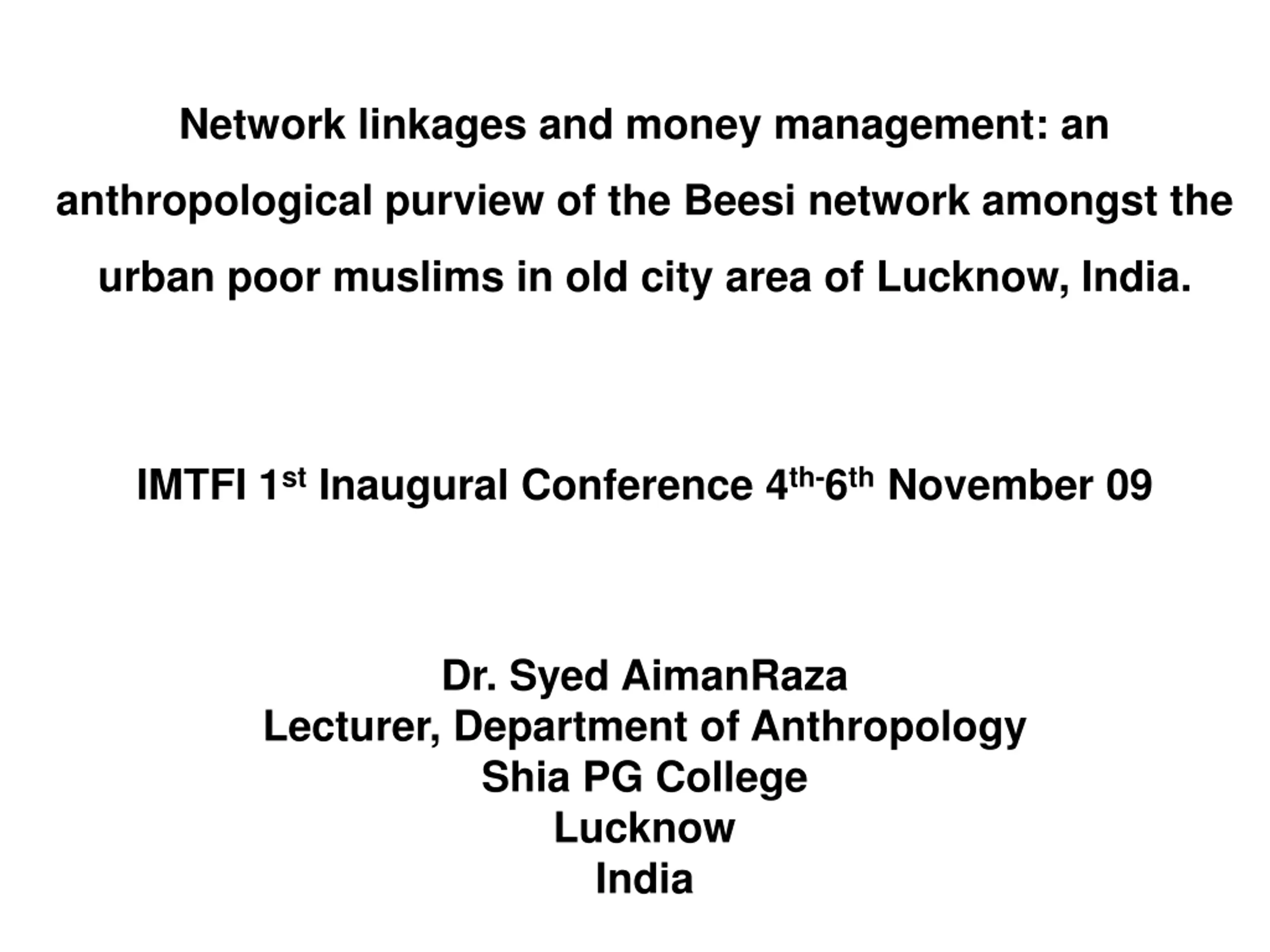 Network linkages and money management: an anthropological purview of the Beesi network amongst the urban poor muslims in old city area of Lucknow, India. IMTFI 1st Inaugural Conference 4th-6th November 09 Dr. Syed AimanRaza Lecturer, Department of Anthropology Shia PG College Lucknow India