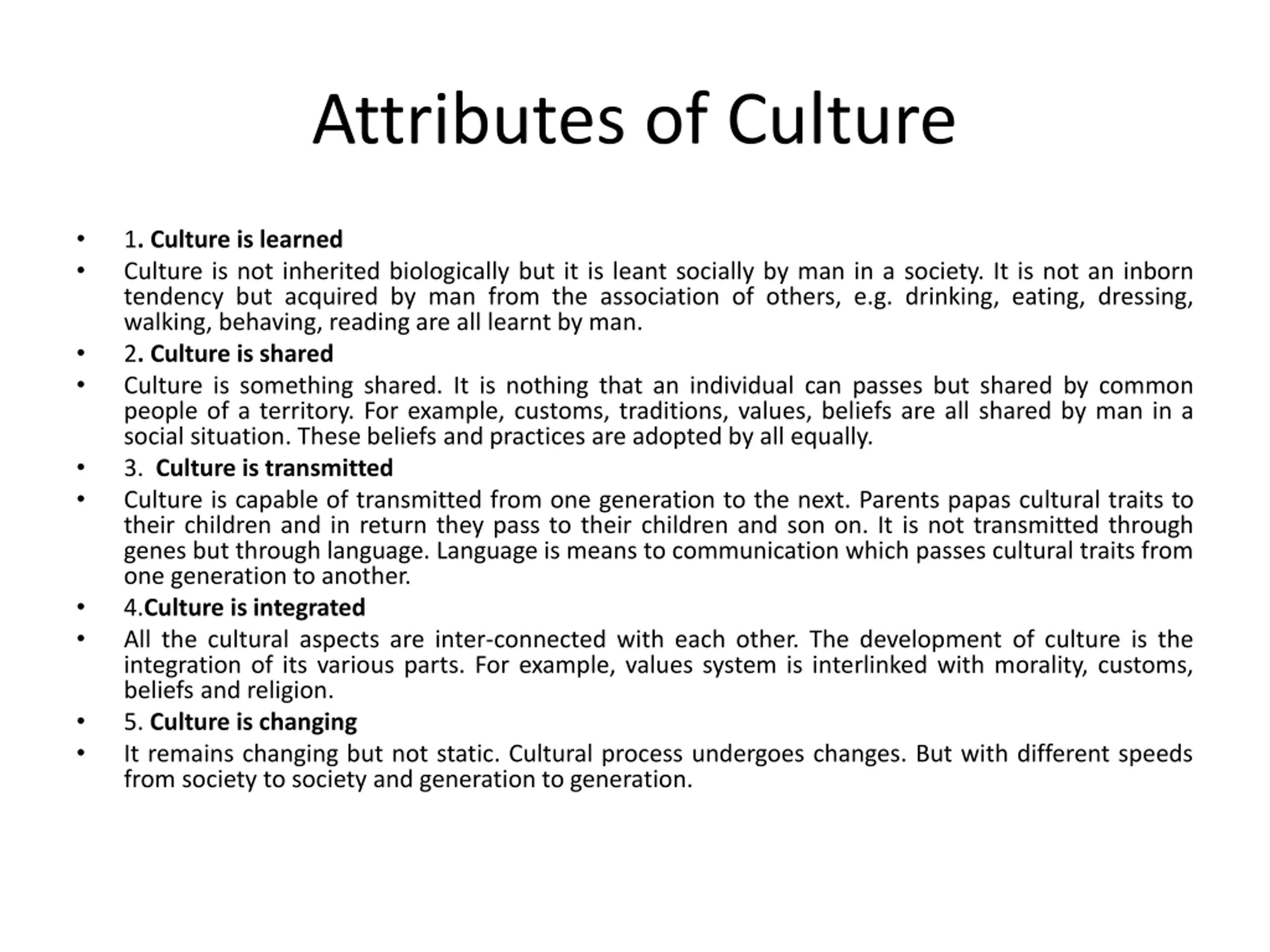 Attributes of Culture 1. Culture is learned Culture is not inherited biologically but it is leant socially by man in a society. It is not an inborn tendency but acquired by man from the association of others, e.g. drinking, eating, dressing, walking, behaving, reading are all learnt by man. 2. Culture is shared Culture is something shared. It is nothing that an individual can passes but shared by common people of a territory. For example, customs, traditions, values, beliefs are all shared by man in a social situation. These beliefs and practices are adopted by all equally. 3. Culture is transmitted Culture is capable of transmitted from one generation to the next. Parents papas cultural traits to their children and in return they pass to their children and son on. It is not transmitted through genes but through language. Language is means to communication which passes cultural traits from one generation to another. 4.Culture is integrated All the cultural aspects are inter-connected with each other. The development of culture is the integration of its various parts. For example, values system is interlinked with morality, customs, beliefs and religion. 5. Culture is changing It remains changing but not static. Cultural process undergoes changes. But with different speeds from society to society and generation to generation.