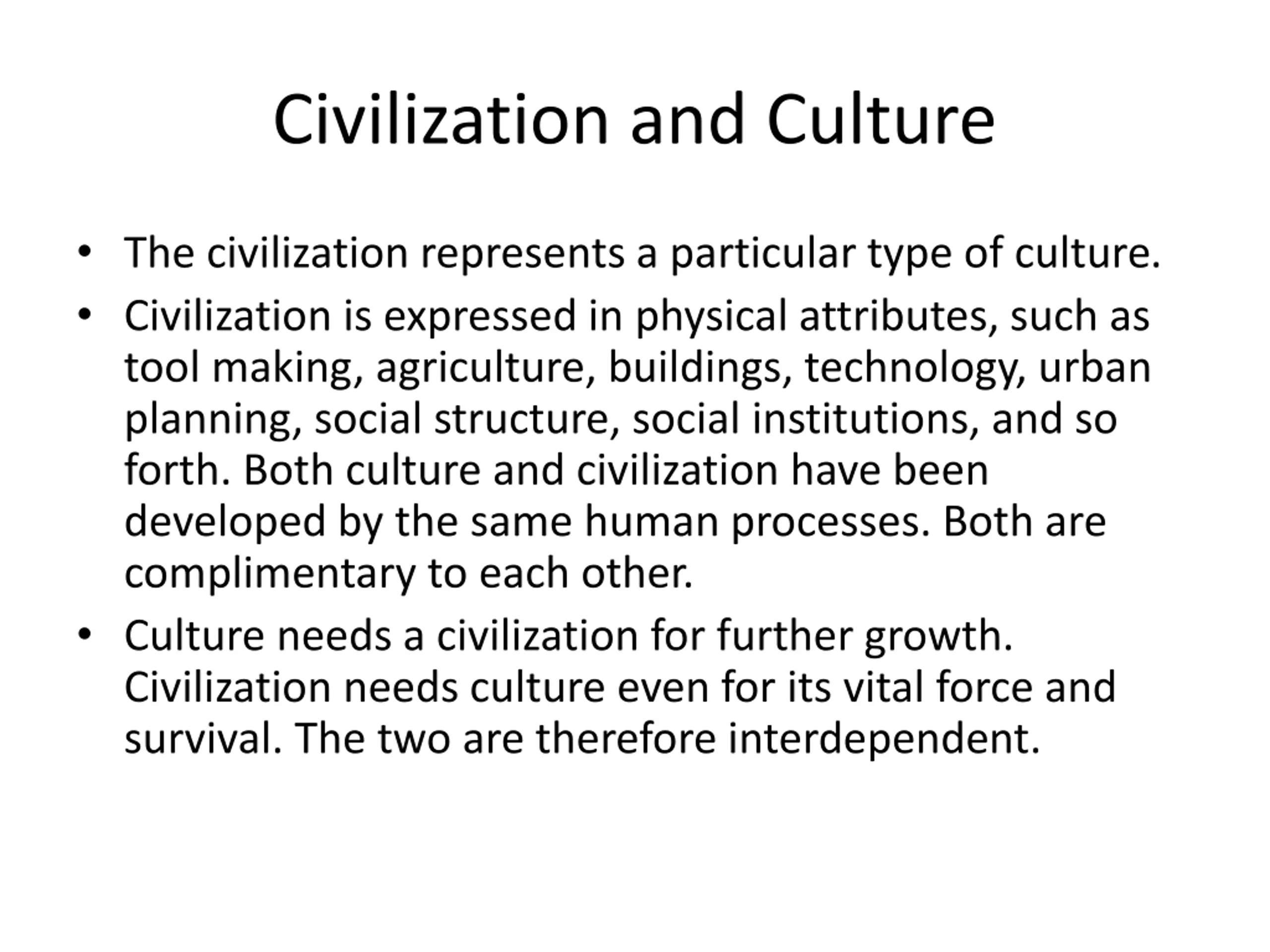 Civilization and Culture The civilization represents a particular type of culture. Civilization is expressed in physical attributes, such as tool making, agriculture, buildings, technology, urban planning, social structure, social institutions, and so forth. Both culture and civilization have been developed by the same human processes. Both are complimentary to each other. Culture needs a civilization for further growth. Civilization needs culture even for its vital force and survival. The two are therefore interdependent.