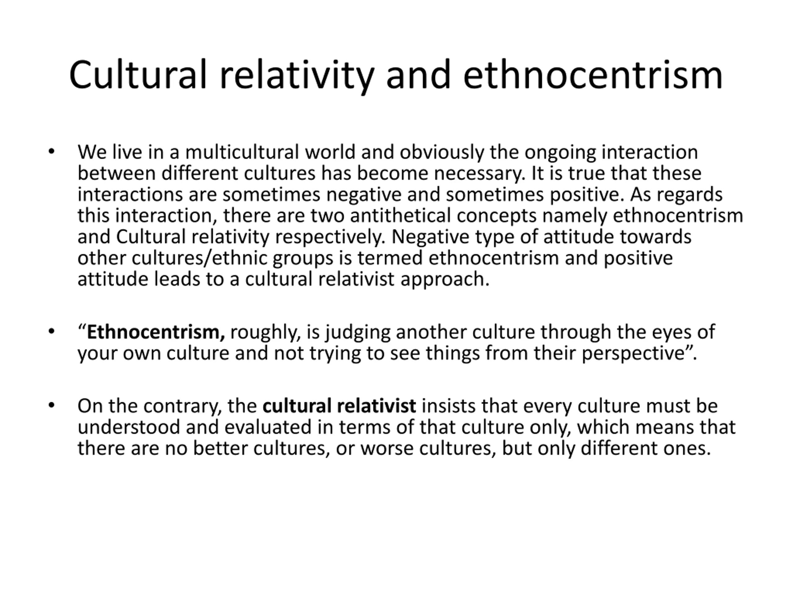 Cultural relativity and ethnocentrism We live in a multicultural world and obviously the ongoing interaction between different cultures has become necessary. It is true that these interactions are sometimes negative and sometimes positive. As regards this interaction, there are two antithetical concepts namely ethnocentrism and Cultural relativity respectively. Negative type of attitude towards other cultures/ethnic groups is termed ethnocentrism and positive attitude leads to a cultural relativist approach. Ethnocentrism, roughly, is judging another culture through the eyes of your own culture and not trying to see things from their perspective . On the contrary, the cultural relativist insists that every culture must be understood and evaluated in terms of that culture only, which means that there are no better cultures, or worse cultures, but only different ones.