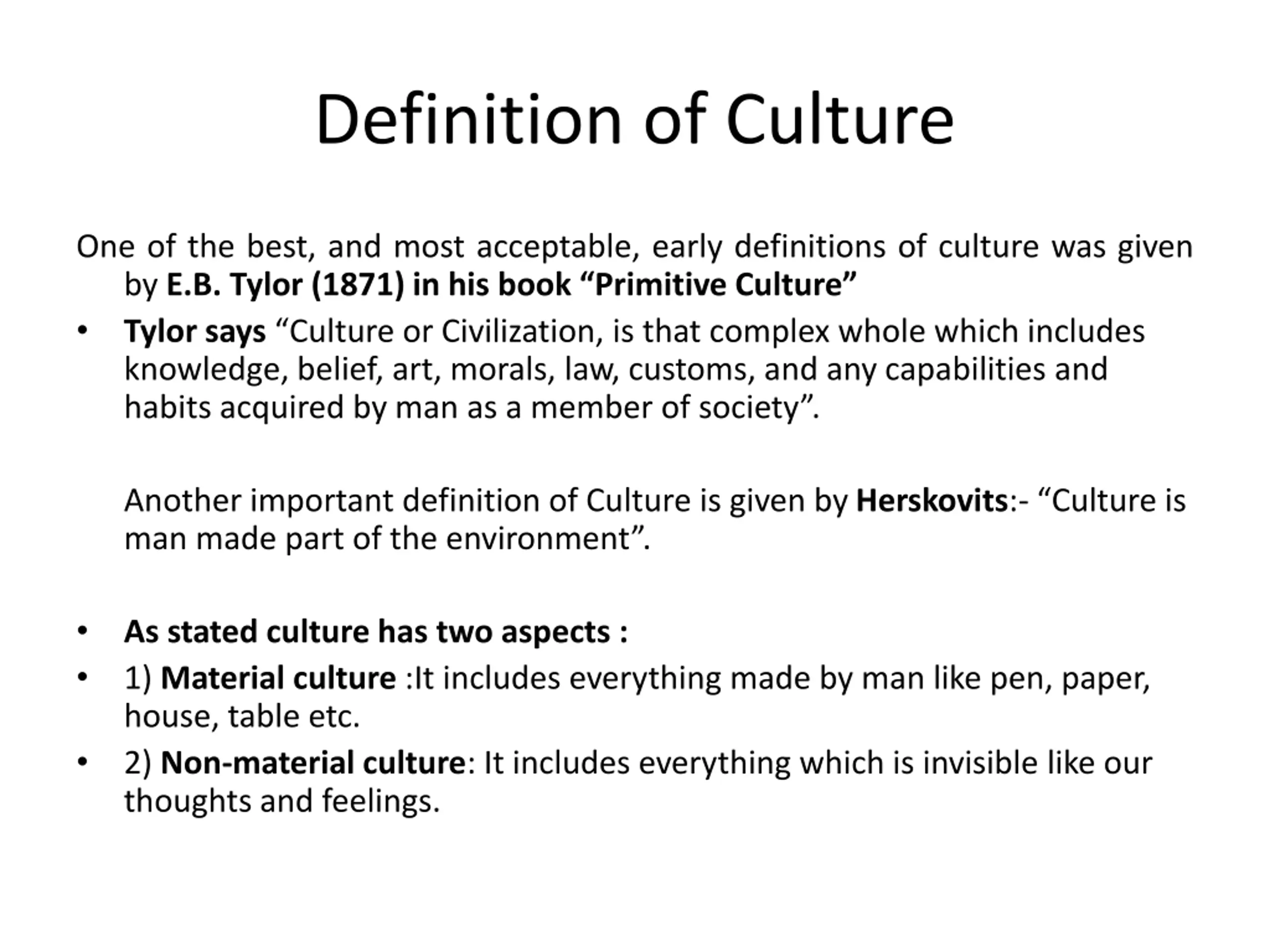 Definition of Culture One of the best, and most acceptable, early definitions of culture was given by E.B. Tylor (1871) in his book Primitive Culture Tylor says Culture or Civilization, is that complex whole which includes knowledge, belief, art, morals, law, customs, and any capabilities and habits acquired by man as a member of society . Another important definition of Culture is given by Herskovits:- Culture is man made part of the environment . As stated culture has two aspects : 1) Material culture :It includes everything made by man like pen, paper, house, table etc. 2) Non-material culture: It includes everything which is invisible like our thoughts and feelings.