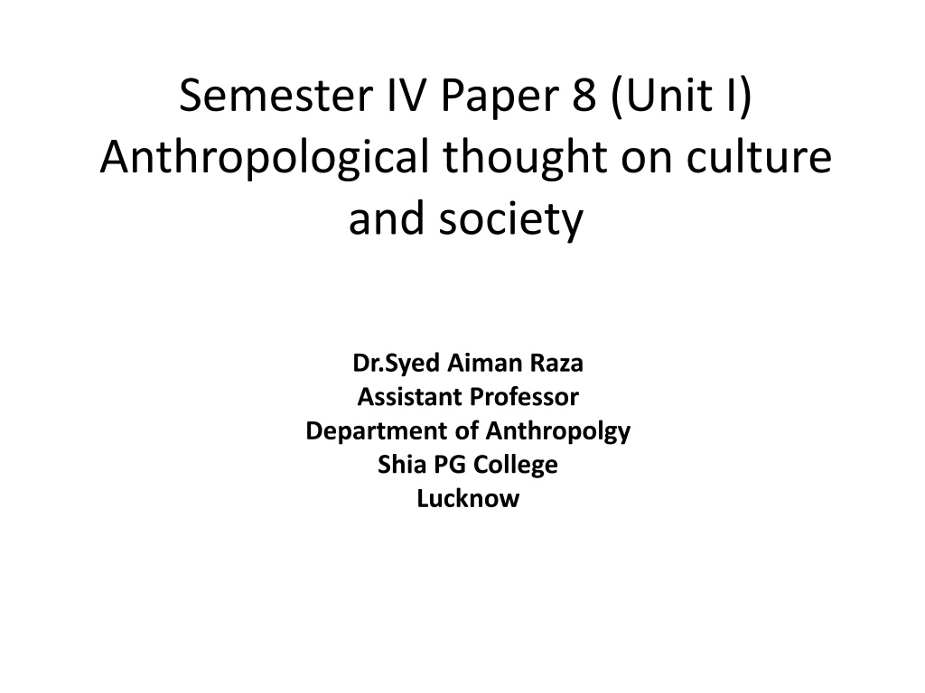 Semester IV Paper 8 (Unit I) Anthropological thought on culture and society Dr.Syed Aiman Raza Assistant Professor Department of Anthropolgy Shia PG College Lucknow