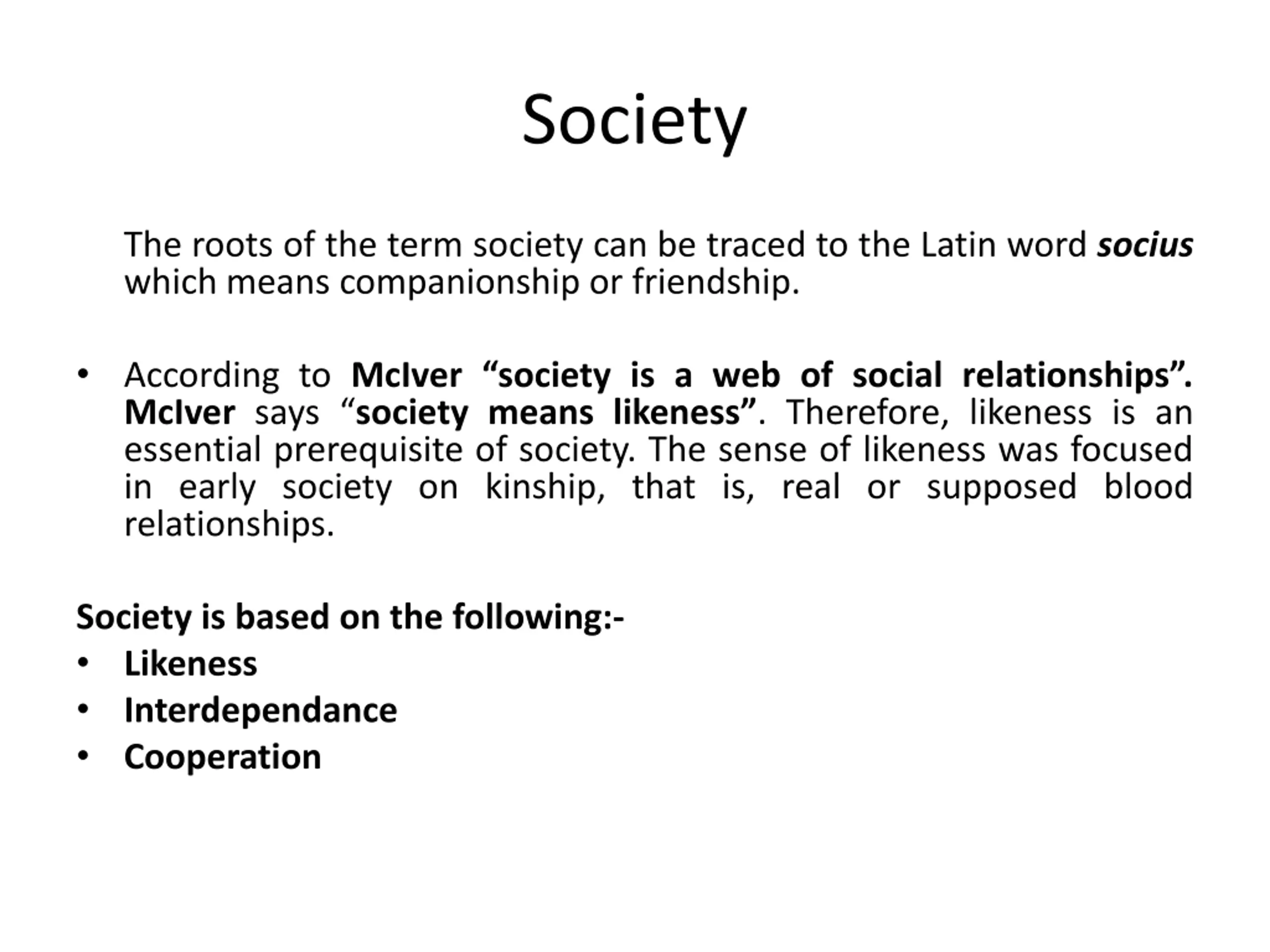 Society The roots of the term society can be traced to the Latin word socius which means companionship or friendship. According to McIver society is a web of social relationships . McIver says society means likeness . Therefore, likeness is an essential prerequisite of society. The sense of likeness was focused in early society on kinship, that is, real or supposed blood relationships. Society is based on the following:- Likeness Interdependance Cooperation
