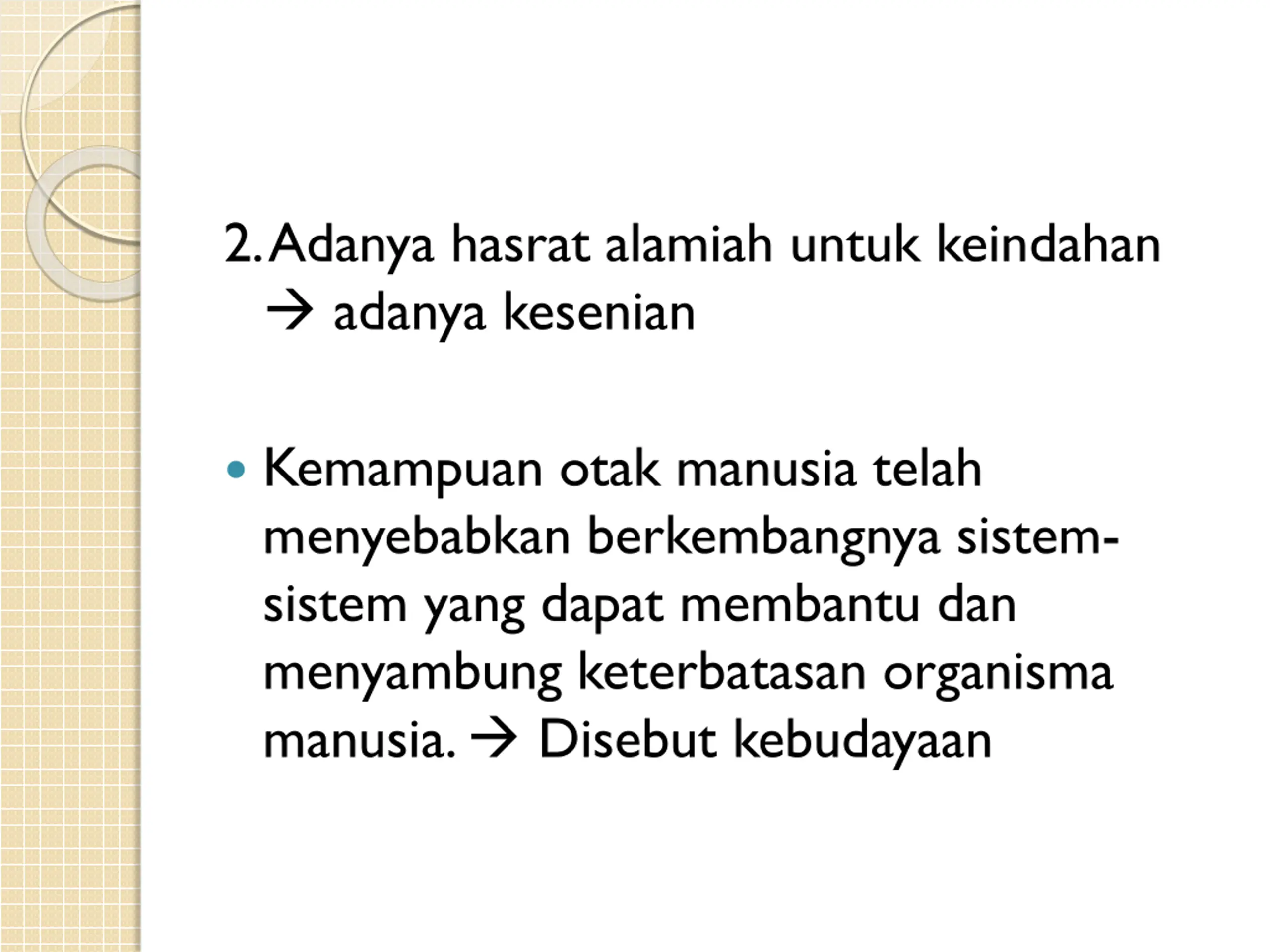2. Adanya hasrat alamiah untuk keindahan adanya kesenian Kemampuan otak manusia telah menyebabkan berkembangnya sistem- sistem yang dapat membantu dan menyambung keterbatasan organisma manusia. Disebut kebudayaan
