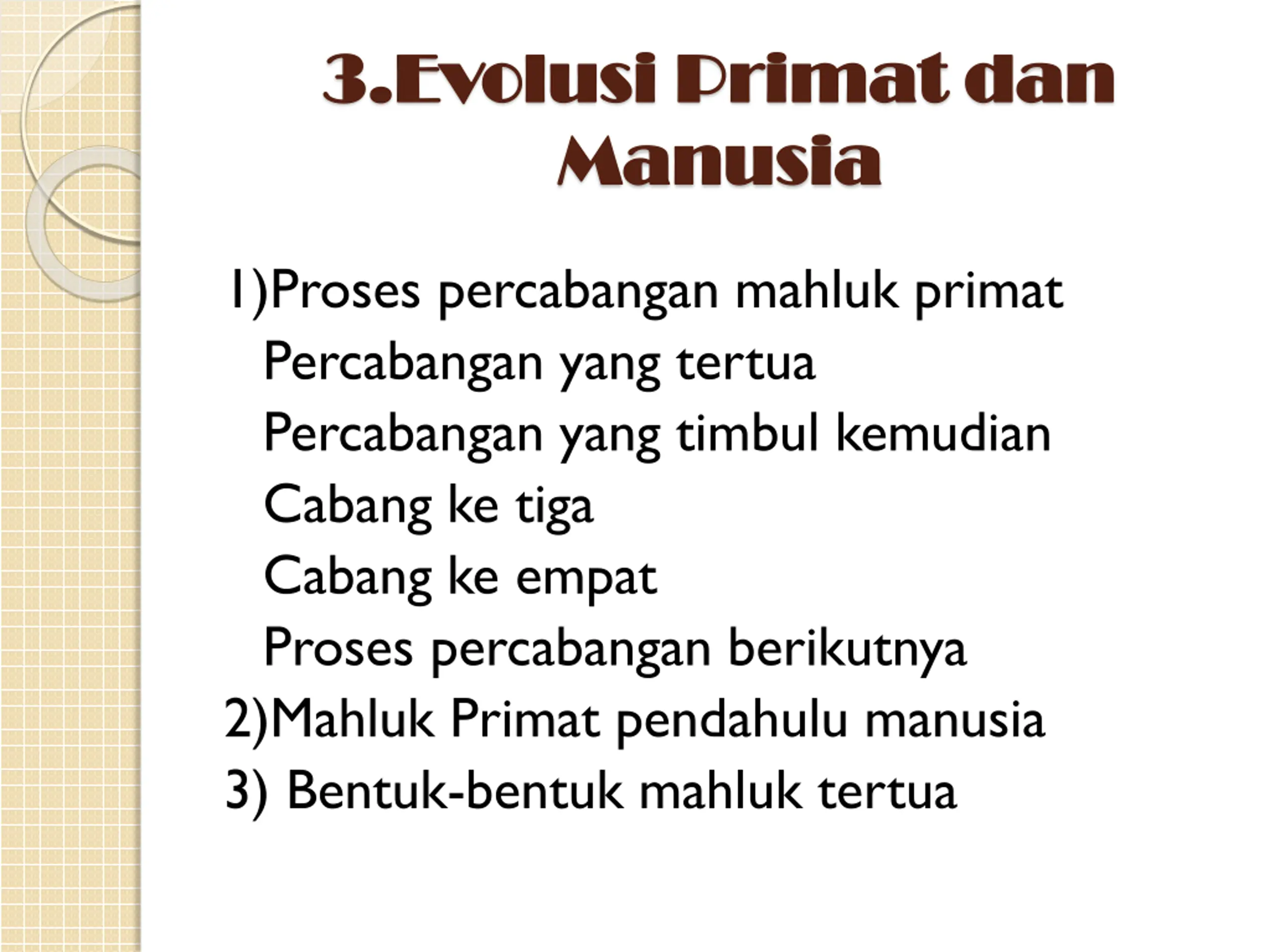 3.Evolusi 3.Evolusi Primat Manusia Manusia Primat dan dan 1)Proses percabangan mahluk primat Percabangan yang tertua Percabangan yang timbul kemudian Cabang ke tiga Cabang ke empat Proses percabangan berikutnya 2)Mahluk Primat pendahulu manusia 3) Bentuk-bentuk mahluk tertua