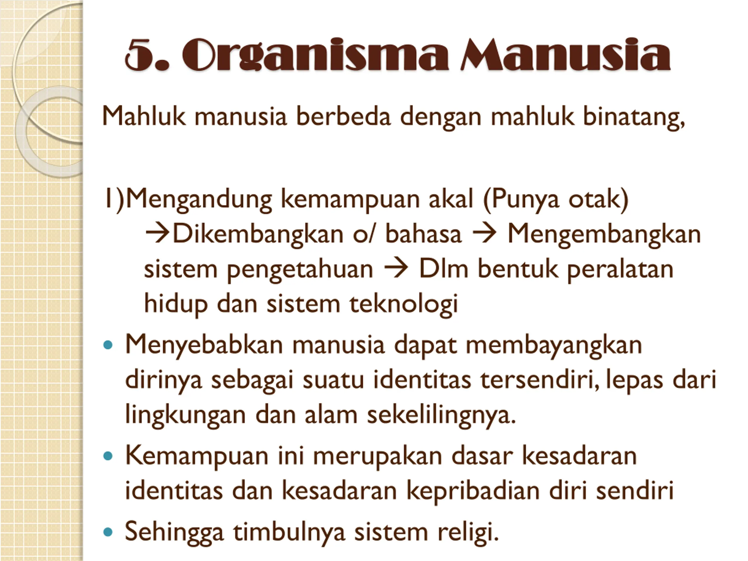 5. 5. Organisma Organisma Manusia Manusia Mahluk manusia berbeda dengan mahluk binatang, 1)Mengandung kemampuan akal (Punya otak) Dikembangkan o/ bahasa Mengembangkan sistem pengetahuan Dlm bentuk peralatan hidup dan sistem teknologi Menyebabkan manusia dapat membayangkan dirinya sebagai suatu identitas tersendiri, lepas dari lingkungan dan alam sekelilingnya. Kemampuan ini merupakan dasar kesadaran identitas dan kesadaran kepribadian diri sendiri Sehingga timbulnya sistem religi.