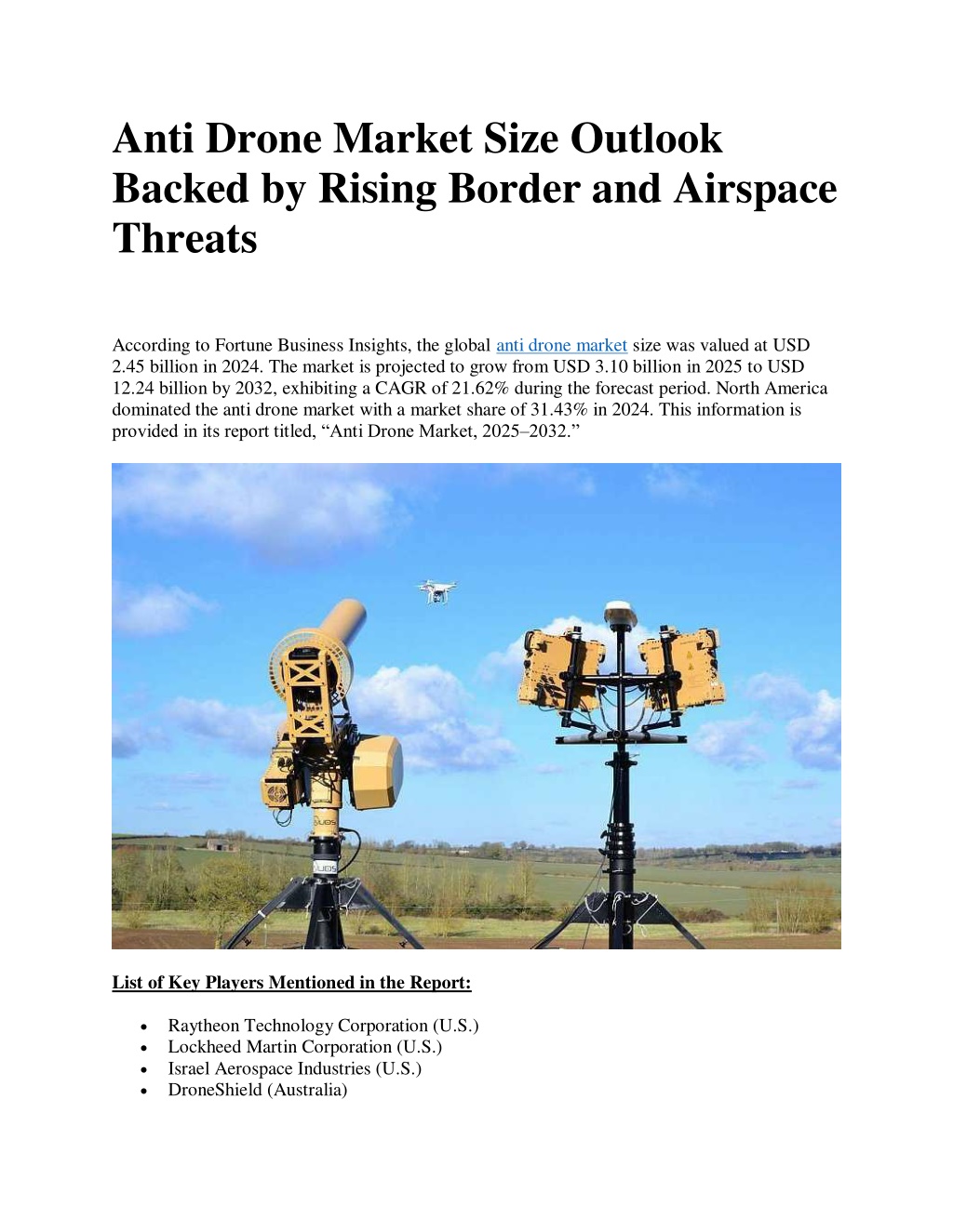 Anti Drone Market Size Outlook Backed by Rising Border and Airspace Threats According to Fortune Business Insights, the global anti drone market size was valued at USD 2.45 billion in 2024. The market is projected to grow from USD 3.10 billion in 2025 to USD 12.24 billion by 2032, exhibiting a CAGR of 21.62% during the forecast period. North America dominated the anti drone market with a market share of 31.43% in 2024. This information is provided in its report titled, Anti Drone Market, 2025 2032. List of Key Players Mentioned in the Report: Raytheon Technology Corporation (U.S.) Lockheed Martin Corporation (U.S.) Israel Aerospace Industries (U.S.) DroneShield (Australia)