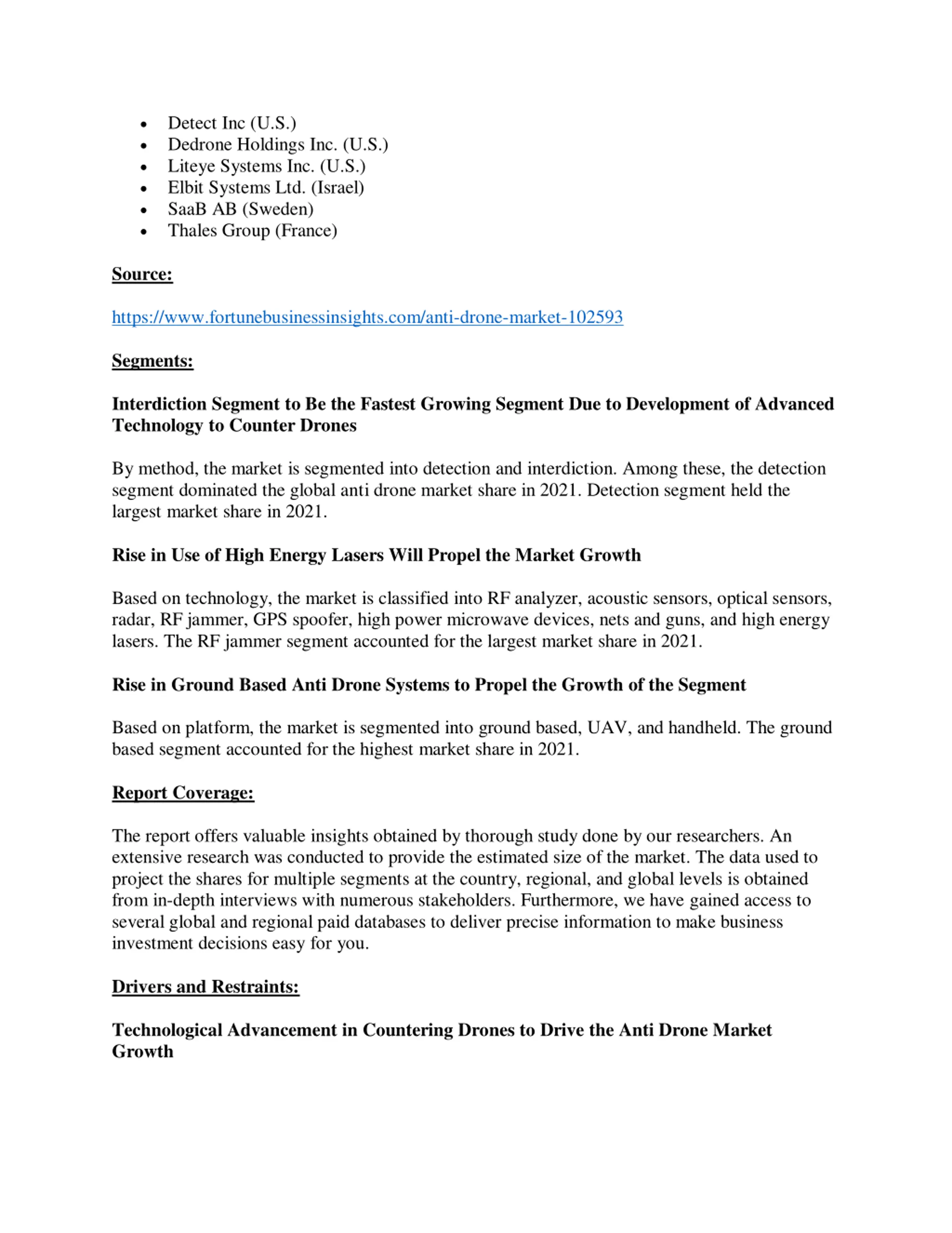 Detect Inc (U.S.) Dedrone Holdings Inc. (U.S.) Liteye Systems Inc. (U.S.) Elbit Systems Ltd. (Israel) SaaB AB (Sweden) Thales Group (France) Source: https://www.fortunebusinessinsights.com/anti-drone-market-102593 Segments: Interdiction Segment to Be the Fastest Growing Segment Due to Development of Advanced Technology to Counter Drones By method, the market is segmented into detection and interdiction. Among these, the detection segment dominated the global anti drone market share in 2021. Detection segment held the largest market share in 2021. Rise in Use of High Energy Lasers Will Propel the Market Growth Based on technology, the market is classified into RF analyzer, acoustic sensors, optical sensors, radar, RF jammer, GPS spoofer, high power microwave devices, nets and guns, and high energy lasers. The RF jammer segment accounted for the largest market share in 2021. Rise in Ground Based Anti Drone Systems to Propel the Growth of the Segment Based on platform, the market is segmented into ground based, UAV, and handheld. The ground based segment accounted for the highest market share in 2021. Report Coverage: The report offers valuable insights obtained by thorough study done by our researchers. An extensive research was conducted to provide the estimated size of the market. The data used to project the shares for multiple segments at the country, regional, and global levels is obtained from in-depth interviews with numerous stakeholders. Furthermore, we have gained access to several global and regional paid databases to deliver precise information to make business investment decisions easy for you. Drivers and Restraints: Technological Advancement in Countering Drones to Drive the Anti Drone Market Growth