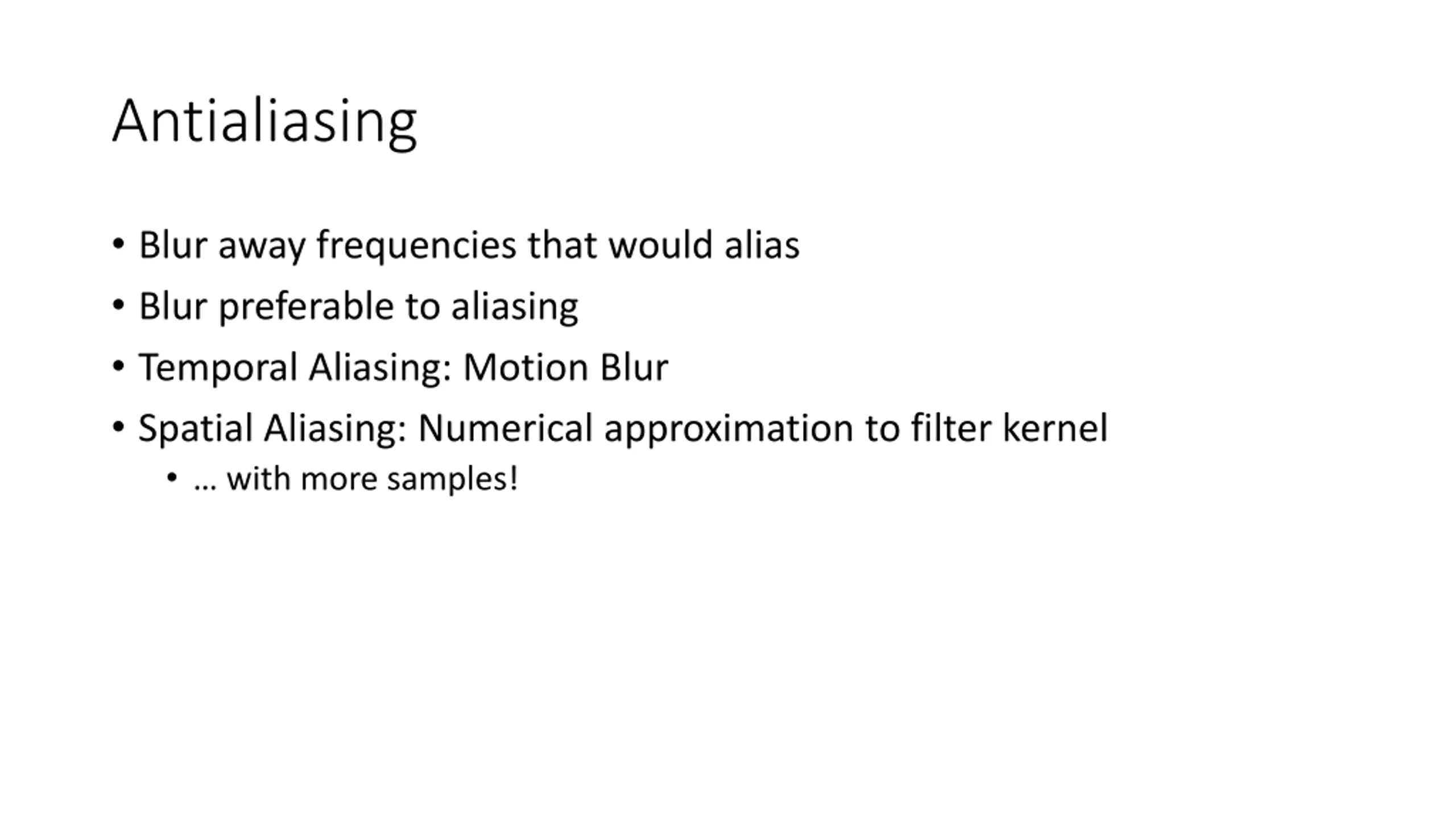 Antialiasing Blur away frequencies that would alias Blur preferable to aliasing Temporal Aliasing: Motion Blur Spatial Aliasing: Numerical approximation to filter kernel with more samples!