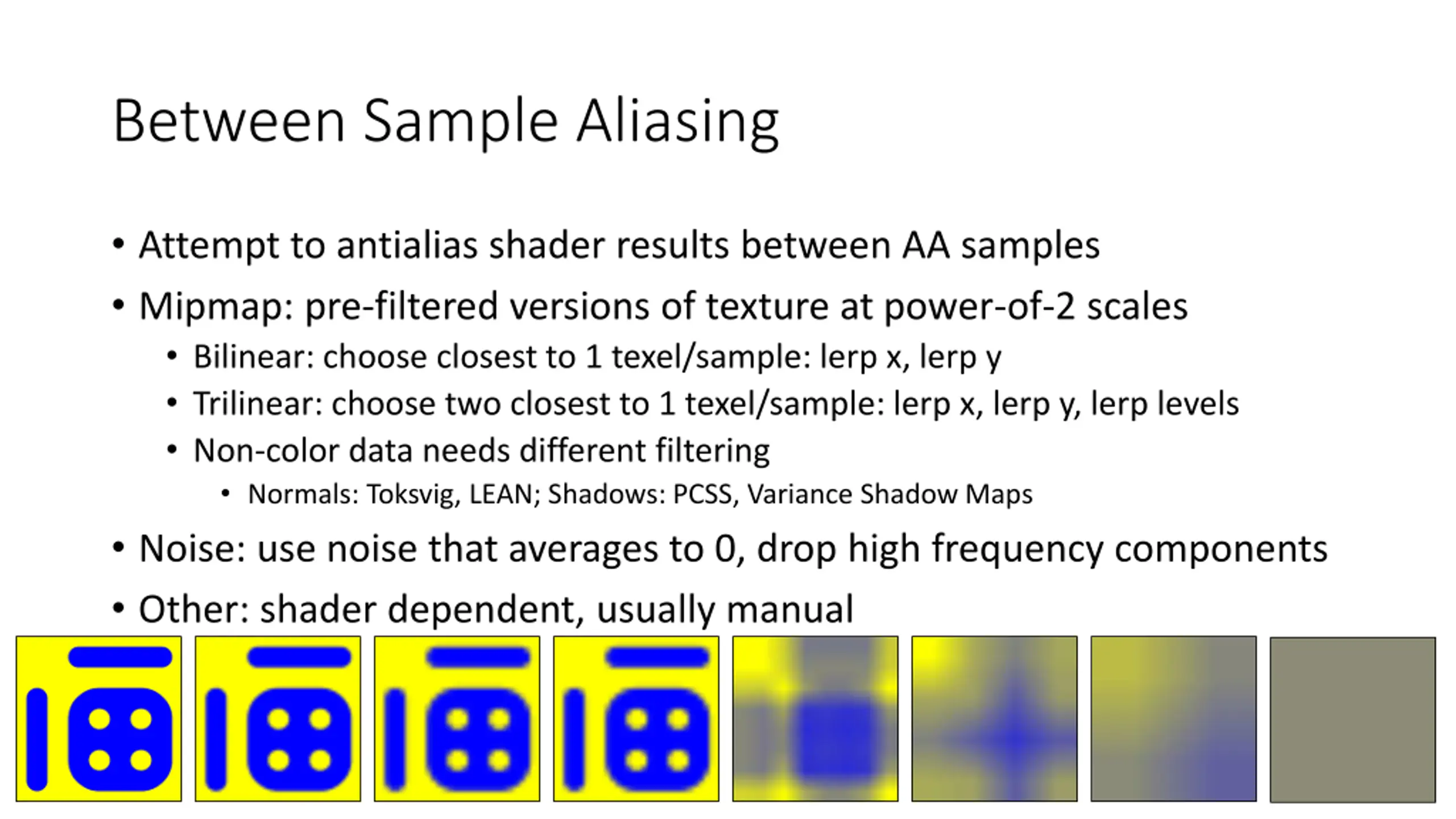 Between Sample Aliasing Attempt to antialias shader results between AA samples Mipmap: pre-filtered versions of texture at power-of-2 scales Bilinear: choose closest to 1 texel/sample: lerp x, lerp y Trilinear: choose two closest to 1 texel/sample: lerp x, lerp y, lerp levels Non-color data needs different filtering Normals: Toksvig, LEAN; Shadows: PCSS, Variance Shadow Maps Noise: use noise that averages to 0, drop high frequency components Other: shader dependent, usually manual