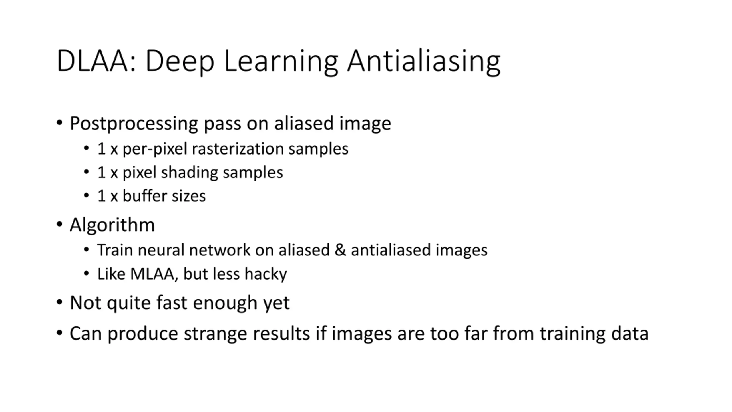 DLAA: Deep Learning Antialiasing Postprocessing pass on aliased image 1 x per-pixel rasterization samples 1 x pixel shading samples 1 x buffer sizes Algorithm Train neural network on aliased & antialiased images Like MLAA, but less hacky Not quite fast enough yet Can produce strange results if images are too far from training data