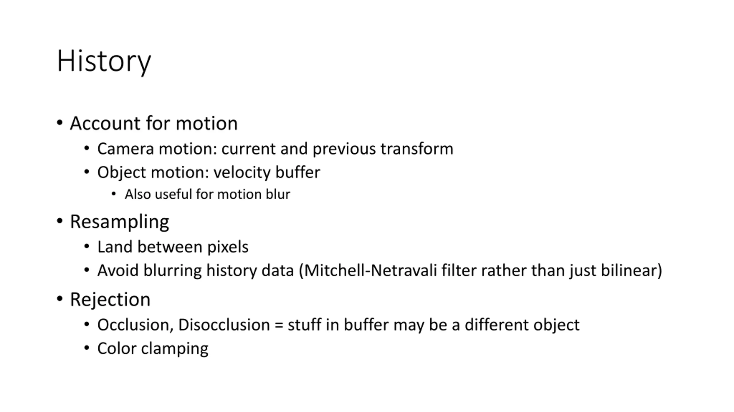History Account for motion Camera motion: current and previous transform Object motion: velocity buffer Also useful for motion blur Resampling Land between pixels Avoid blurring history data (Mitchell-Netravali filter rather than just bilinear) Rejection Occlusion, Disocclusion = stuff in buffer may be a different object Color clamping