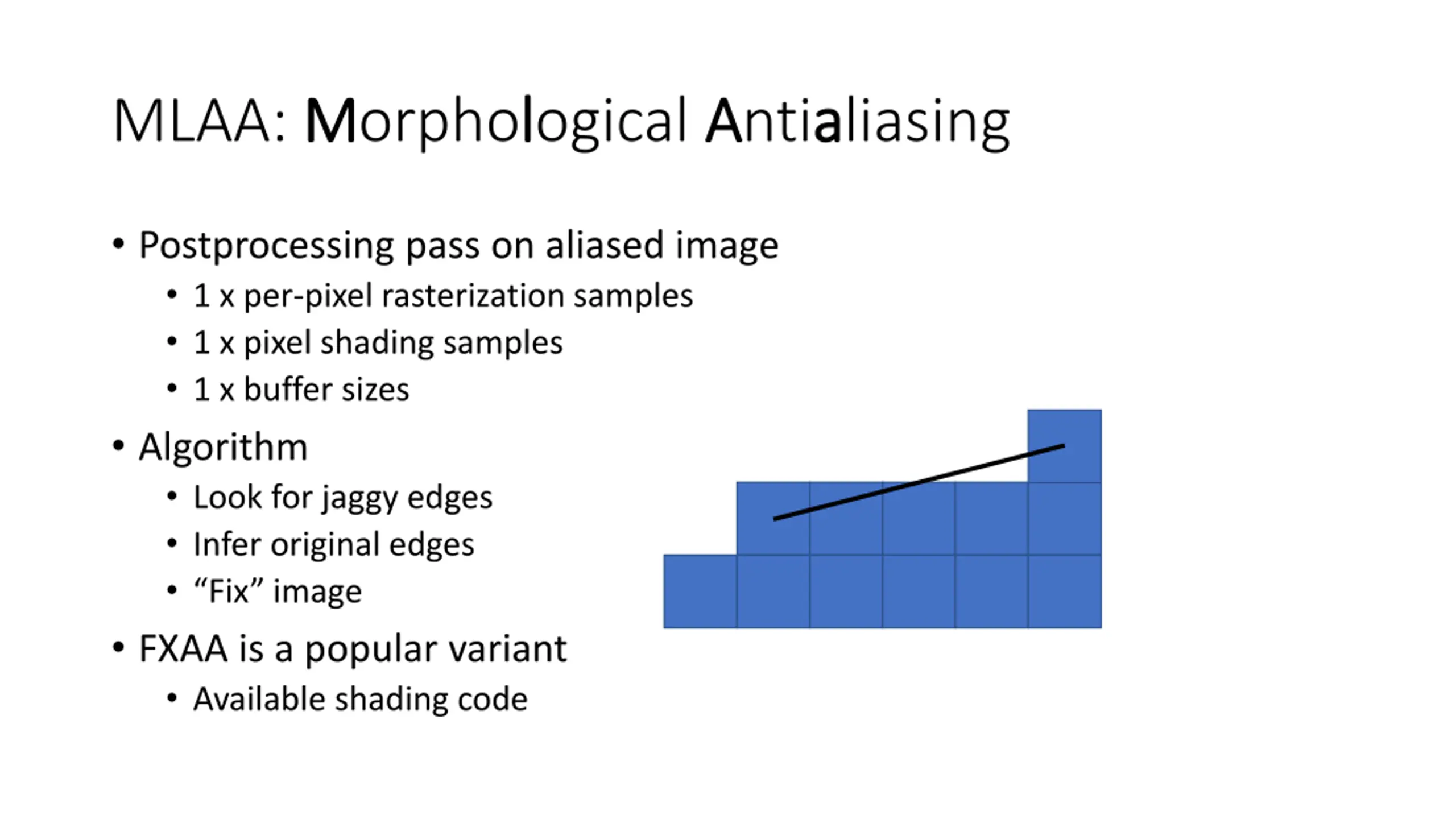 MLAA: M Morphol logical A Antia aliasing Postprocessing pass on aliased image 1 x per-pixel rasterization samples 1 x pixel shading samples 1 x buffer sizes Algorithm Look for jaggy edges Infer original edges Fix image FXAA is a popular variant Available shading code
