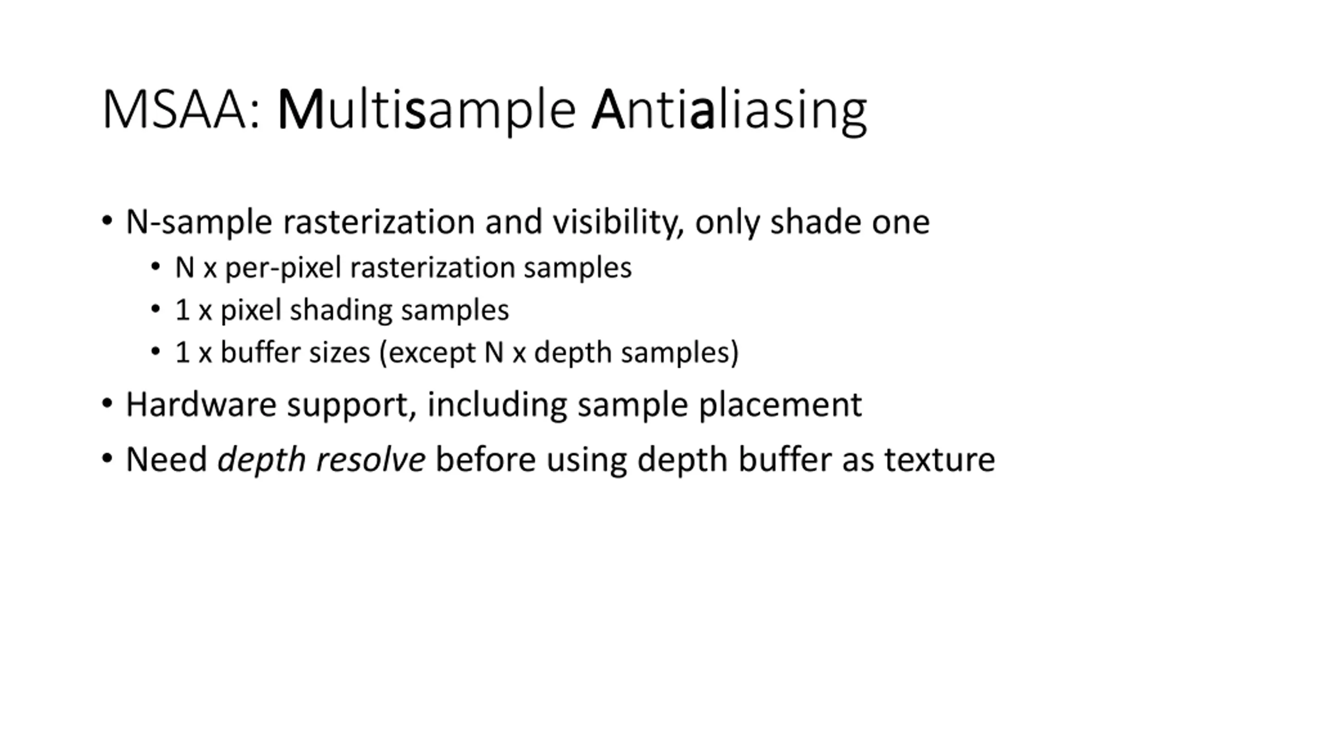 MSAA: M Multis sample A Antia aliasing N-sample rasterization and visibility, only shade one N x per-pixel rasterization samples 1 x pixel shading samples 1 x buffer sizes (except N x depth samples) Hardware support, including sample placement Need depth resolve before using depth buffer as texture