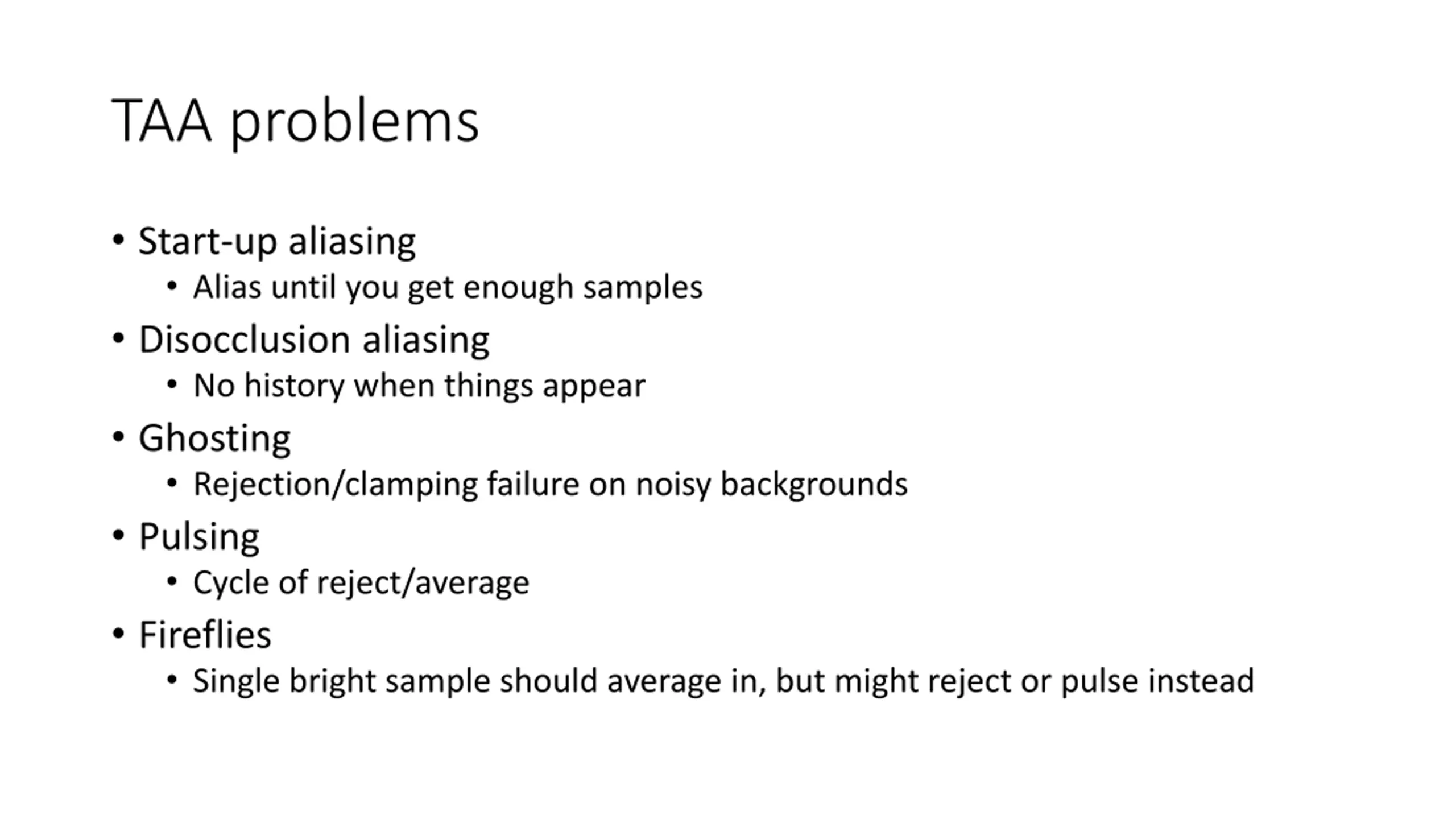 TAA problems Start-up aliasing Alias until you get enough samples Disocclusion aliasing No history when things appear Ghosting Rejection/clamping failure on noisy backgrounds Pulsing Cycle of reject/average Fireflies Single bright sample should average in, but might reject or pulse instead
