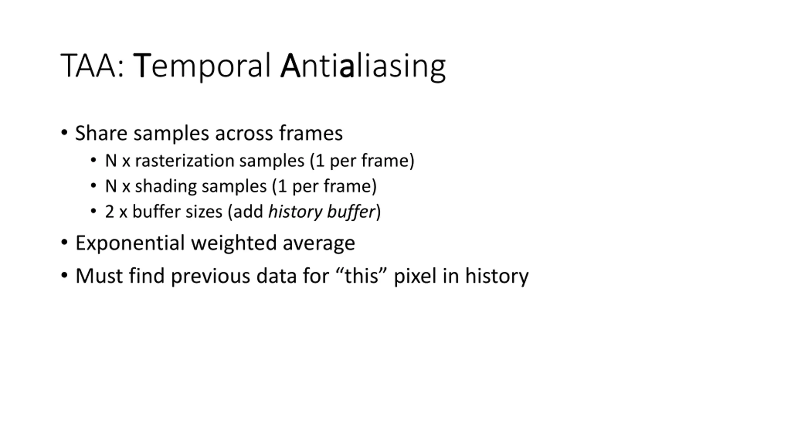 TAA: T Temporal A Antia aliasing Share samples across frames N x rasterization samples (1 per frame) N x shading samples (1 per frame) 2 x buffer sizes (add history buffer) Exponential weighted average Must find previous data for this pixel in history